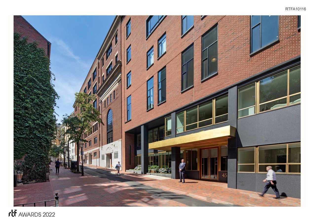The Donahue building – constructed in the 1960s to house a new law library, classrooms, and lecture space – strikes a compelling aesthetic balance with The Archer building. The new design strengthens The Donahue’s original Modernist statement while improving the response to the historic neighborhood context. The original brick façade was replaced with new cladding in a historically contextual palette of red brick and granite. At ground level, bronzed storefront windows with smooth granite surrounds and columns generate an inviting presence along the alley-like Temple Street, and offer a complementary juxtaposition to the rough stone apse of an adjacent church. Higher up, a new line of horizontal ribbon windows on the fifth and sixth floors form a visual cornice line at the fourth story, creating a better alignment with the adjacent low-rise historic buildings on either side of the street. Individual materials were selected for their sustainability and long product lifecycle as well as their appropriateness to the surrounding Beacon Hill architecture.