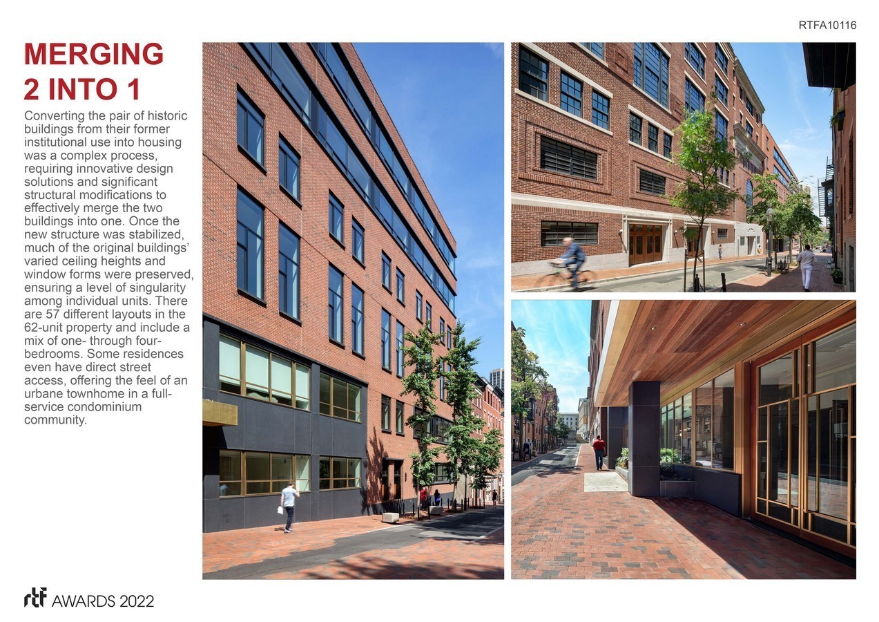 The Archer Residences, a 62-unit condominium building in Boston’s historic Beacon Hill neighborhood, combines two former Suffolk University historic buildings into a single, 172,000 square foot luxury multifamily structure. The inventive design solution creatively reimagines and successfully demonstrates how a Mid-Century Modern and a 1920s Classic Revival structure can blend harmoniously with historic surroundings.