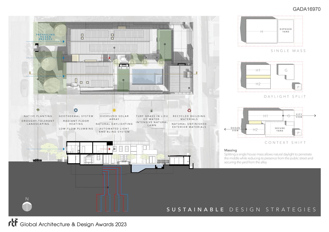 In addition to daylighting and passive cooling through the thermal chimney effect of the glass hall, the house uses a sizable geothermal system and PV array to minimize its environmental impact greatly.