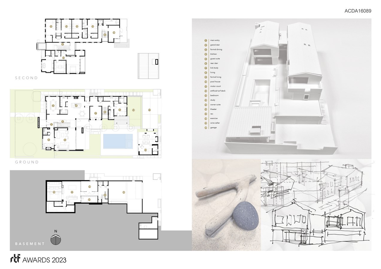 Splitting the house mass down the middle gave the home a more modest street presence while opening its center and allowing natural daylight to spill in. The two-story volume serves to announce entry, receive guests, and showcase the home’s monumental stair.