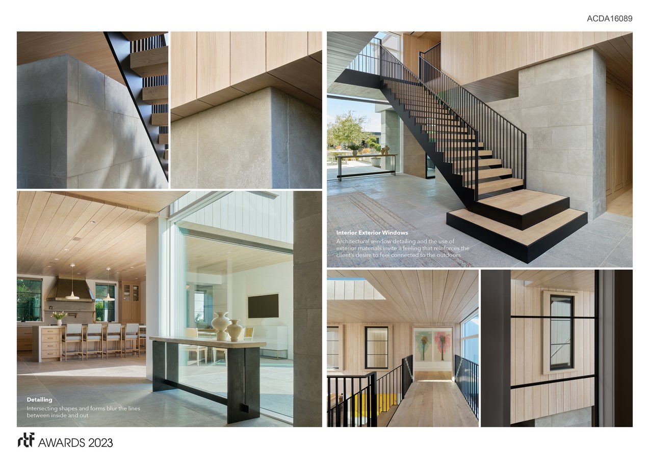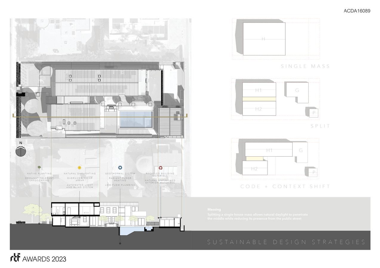 In addition to daylighting and passive cooling through the glass hall thermal chimney effect and operable windows, the house uses a high-efficiency geothermal system and large solar PV array to lessen its environmental impact.