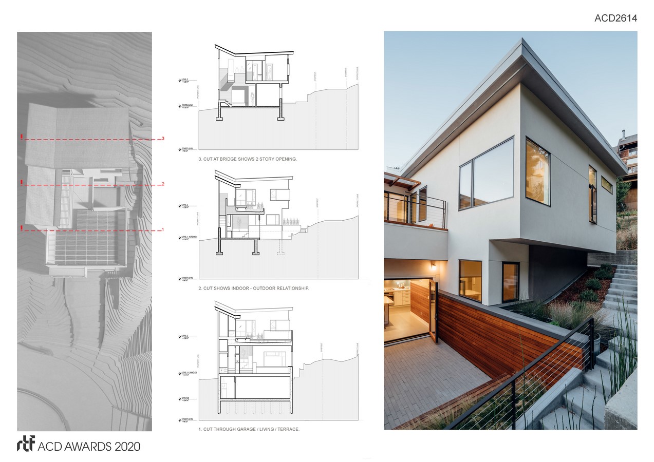 The tiered structure culminates in a roof deck framing views of the Bay and Mount Tamalpais. The next lower tier focuses the eyes on the interrelationship among the rooms to and from the courtyard. These apertures enhance the visual experience, volumetric changes, and the impact of transitional spaces.