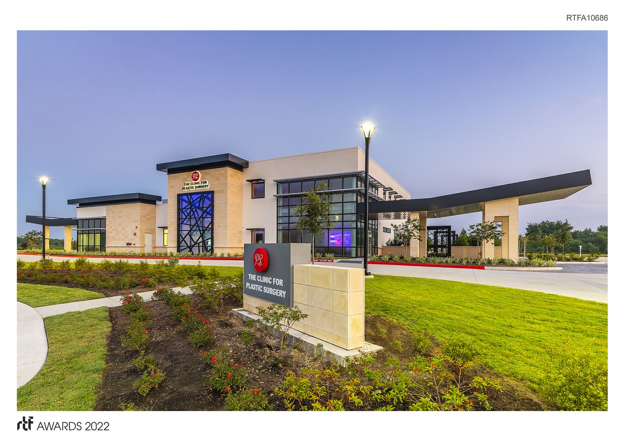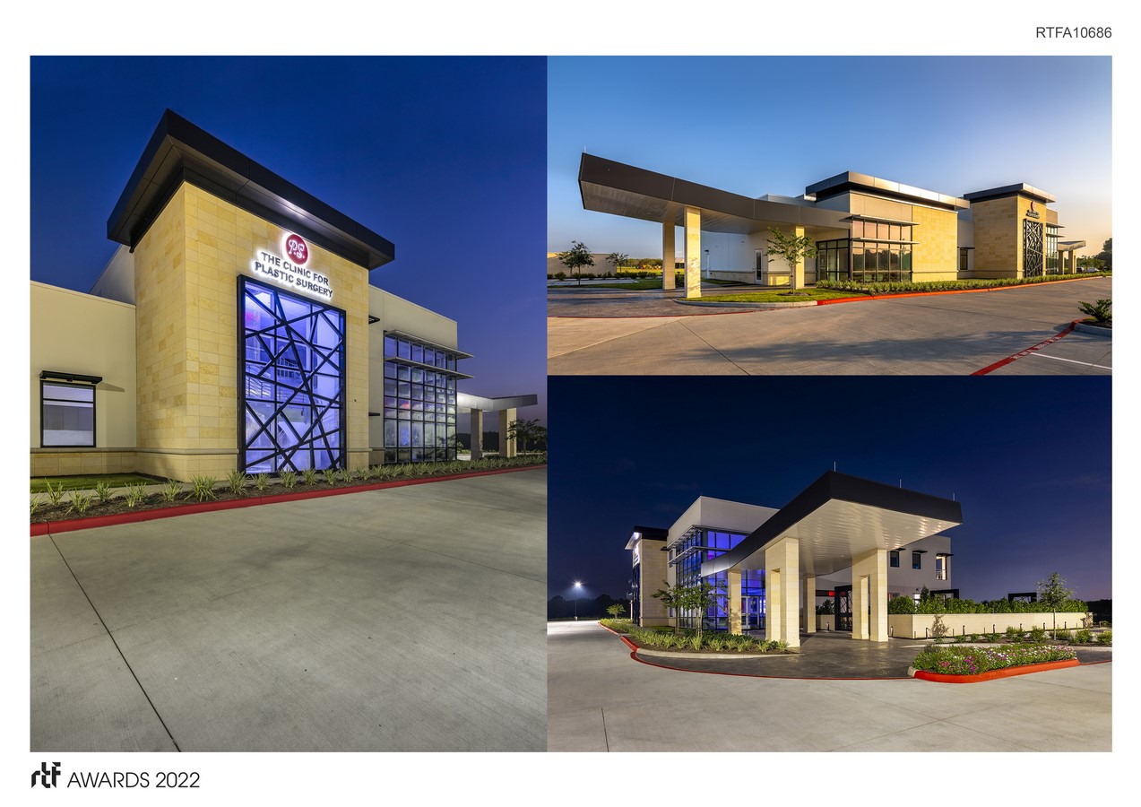 The design includes a ground-up two-story tiltwall and structural steel framed building with separate parking areas for surgical patients and the clinic and med spa guests. The building design features an expansive glass façade at the main entrance with carefully placed solar shading, as well as soaring drop-off canopies at each of the main entrances, reflecting the project site’s proximity to Ellington Airport nearby.