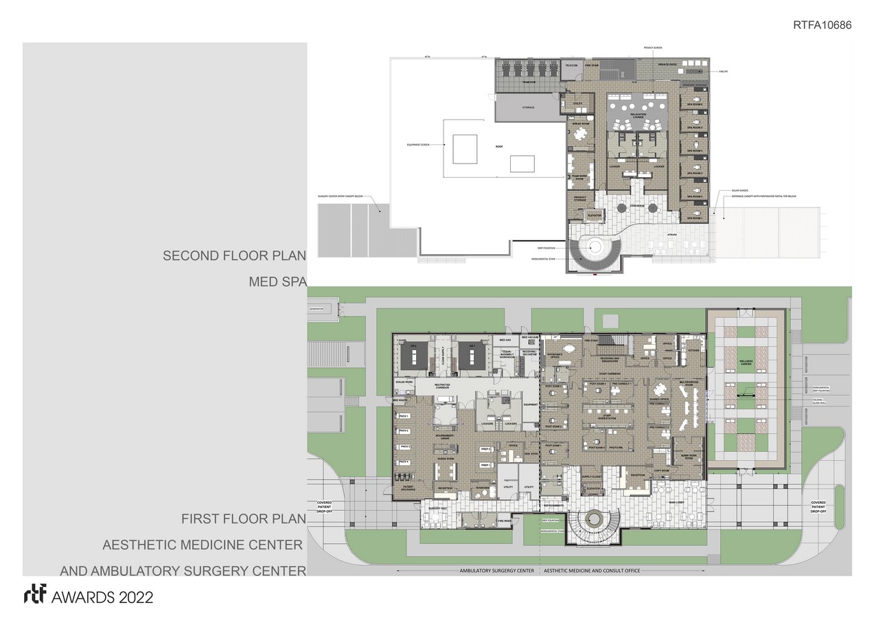 The state-of-the-art facility provides an expressive and peaceful setting for the two-O.R. licensed ambulatory surgery center and aesthetic medicine clinic on the ground floor and the relaxing, luxurious med spa on the second floor.