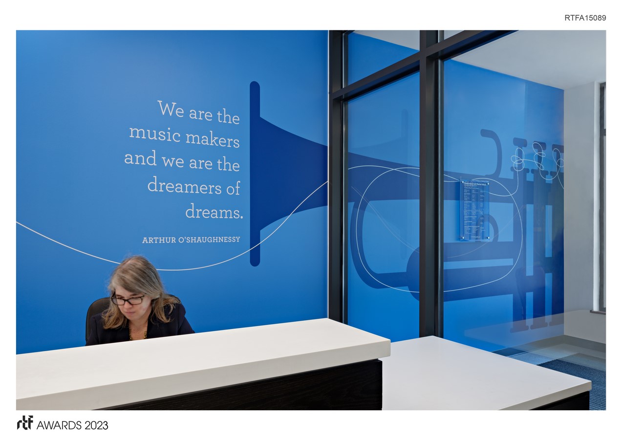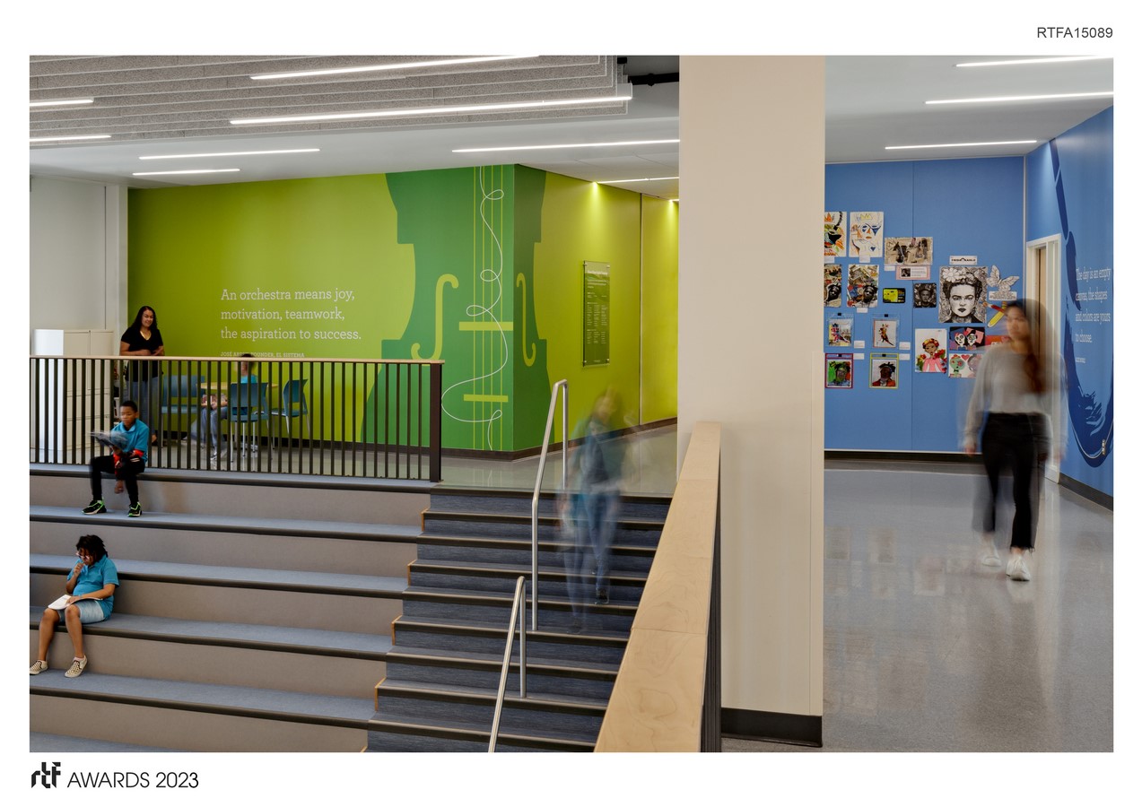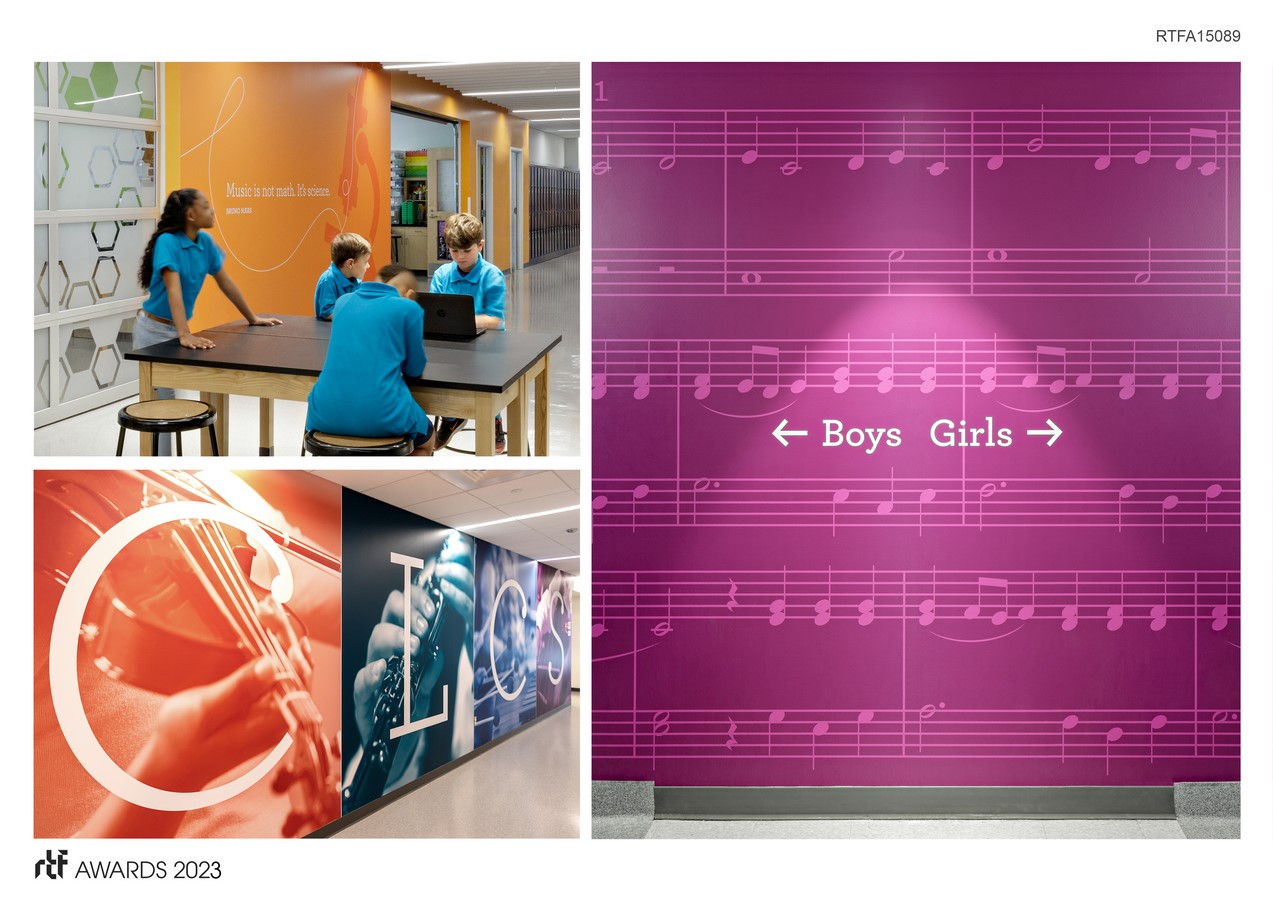 At the heart of the environmental graphics is the main theme, “The Shape of Music,” which showcases the beauty of musical instruments and the ways in which music can be visually represented. The oversized musical instrument silhouettes, rendered in the school’s vibrant color palette, serve as focal points in key gathering areas throughout the building, and are paired with inspiring quotes from the program’s founder and other notable figures such as Bruno Mars. Additionally, to highlight the diverse range of subjects taught at the school beyond music, oversized instruments representing other areas of study are displayed on the walls leading to the corresponding classrooms. art and science rooms.