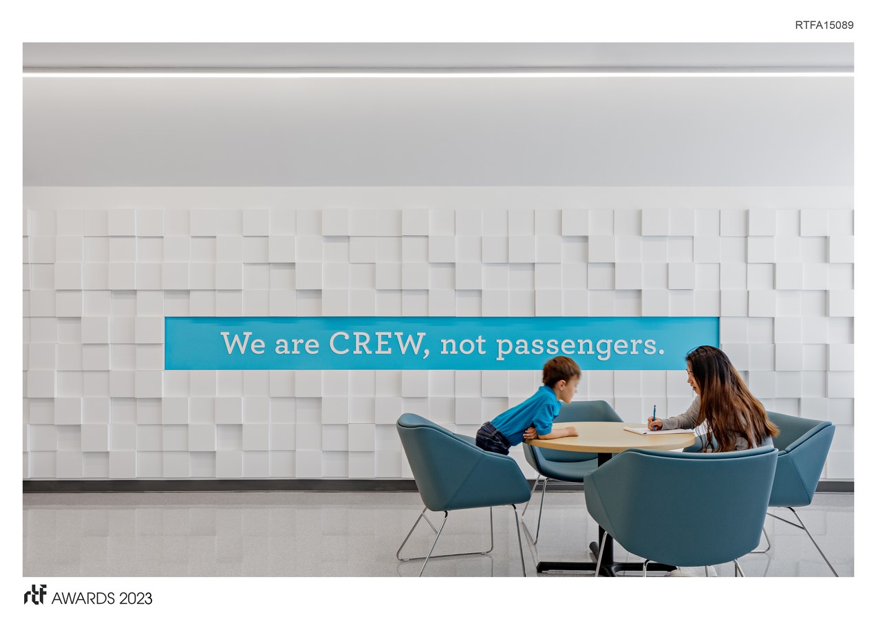 The school’s motto, “We are crew, not passengers,” takes center stage in the main reception area, surrounded by a dramatic three-dimensional wall designed to capture the rhythm and movement of music. This installation not only provides a warm welcome to visitors, but was designed to showcase student artwork, reinforcing the school’s message and giving passing onlookers outside a glimpse into the school’s vibrant culture.