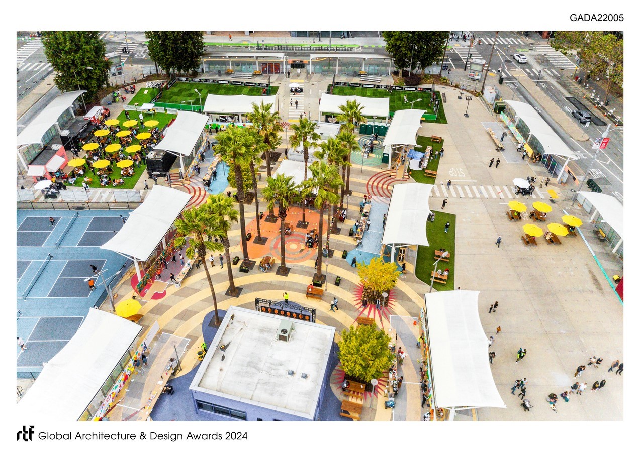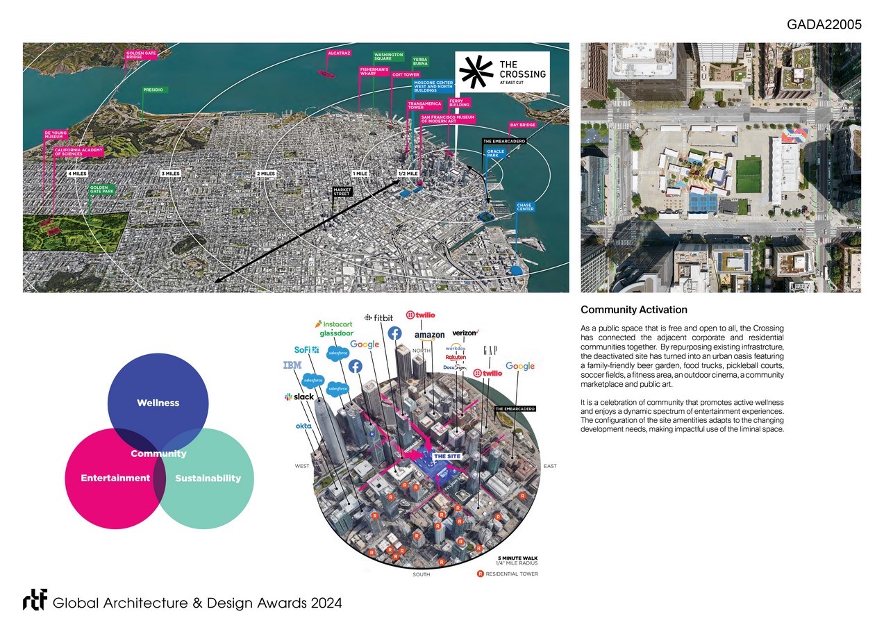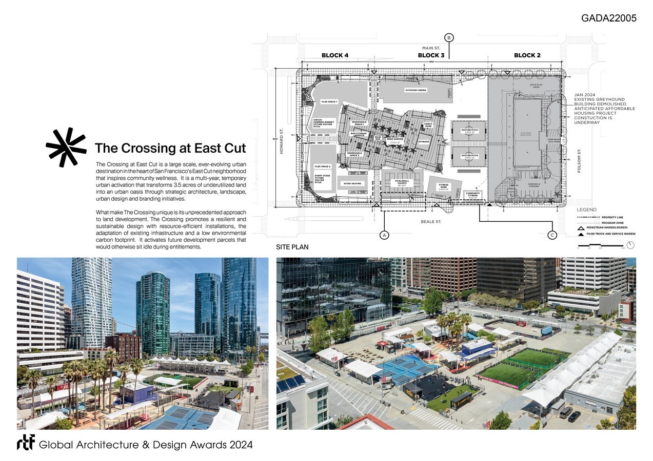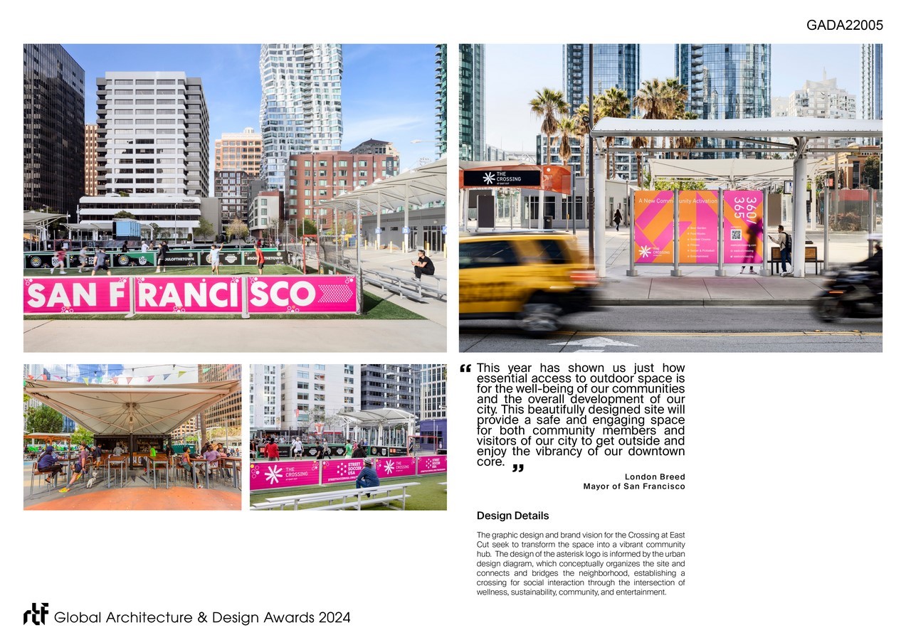 The Crossing at East Cut in San Francisco, CA is a multi-year temporary urban activation in response to bringing people together after the pandemic. Through a public and private sector partnership, the 3.5-acre former Temporary Transit Terminal has been transformed into a new regional destination for locals and tourists alike.