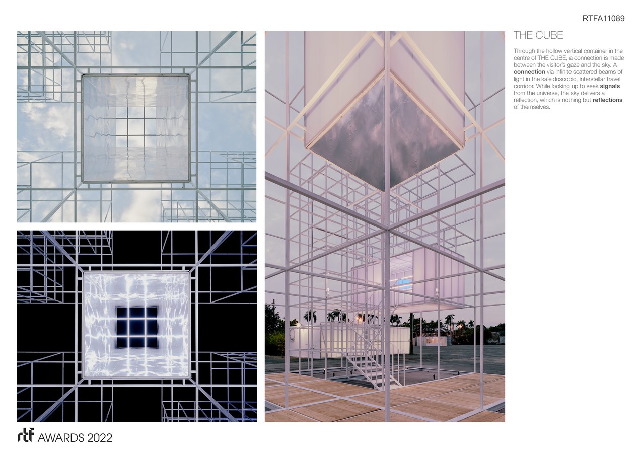 The pulsating translucent horizontal vessels evoke curiosity, and guide visitors into the centre of THE CUBE, while the pulsating rhythm of light and dark represents the pulse of life and the rise and fall of the planet. Through the hollow vertical container in the centre of THE CUBE, a connection is made between the visitor’s gaze and the sky. A connection via infinite scattered beams of light in the kaleidoscopic, interstellar travel corridor. While looking up to seek signals from the universe, the sky delivers a reflection, which is nothing but reflections of themselves.