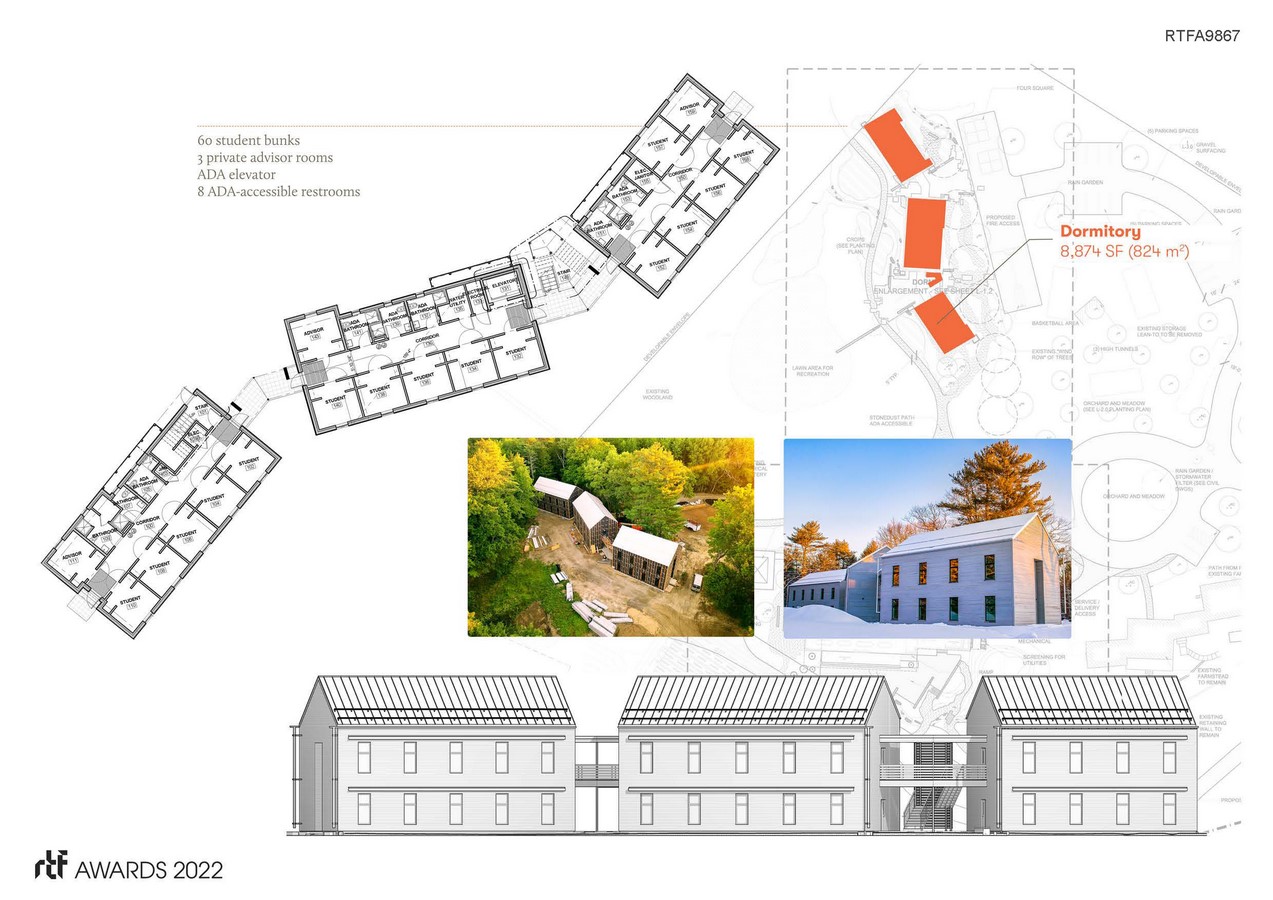 Mindfully developed within 8.2 acres, The Ecology School’s new campus is on track to become one of the nation’s most sustainable residential environmental learning centers and the first certified International Living Future Institute Living Community. The first phase of the project, completed in 2021, installed a new Dining Commons with a commercial kitchen and trio of interconnected Dormitories containing 144 beds. Future work will introduce a second, smaller dormitory, staff housing, and renovations to the site’s original farmhouse and barn.