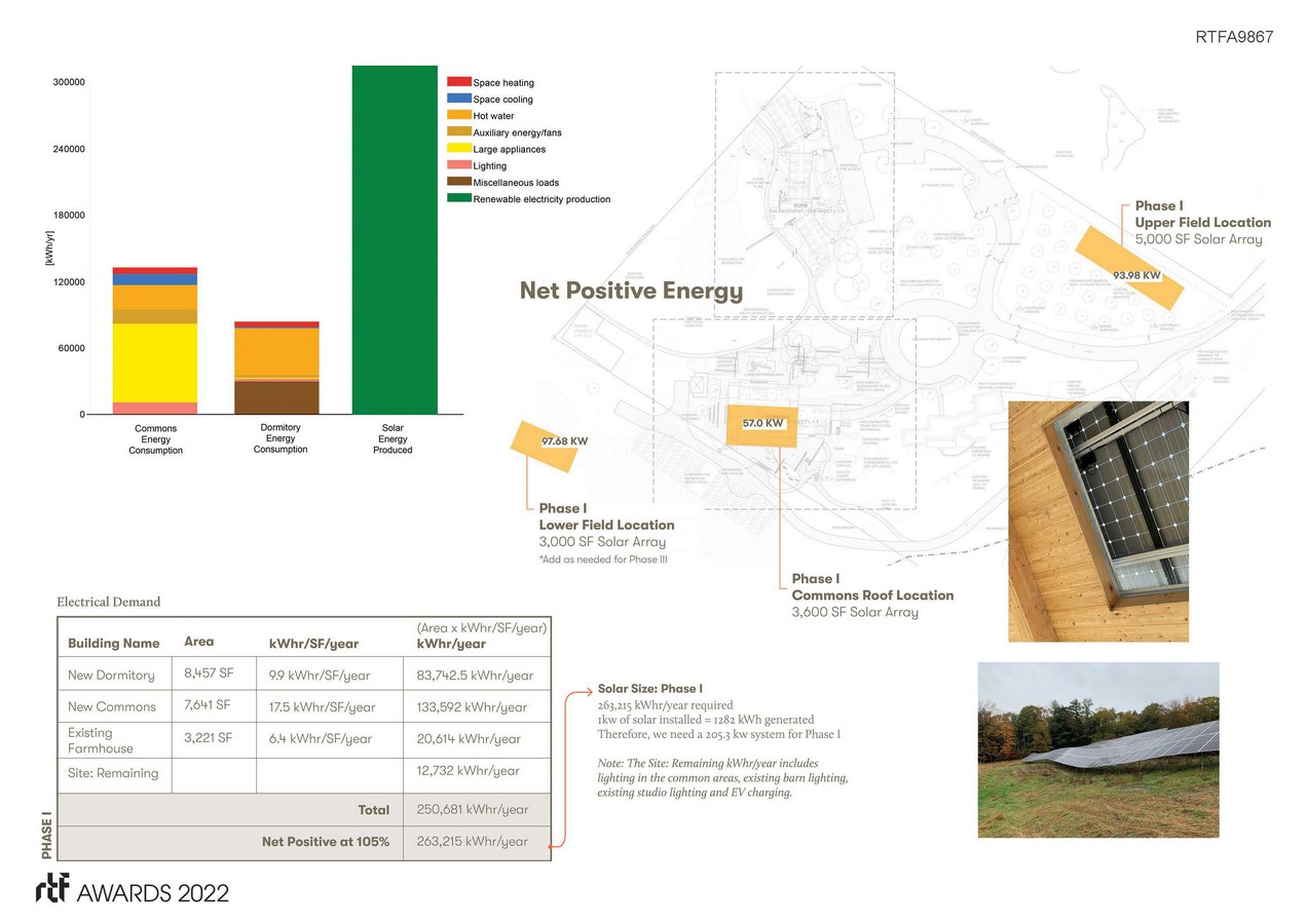 Energy demands are lessened by passive solar heating, efficiency and right-sizing of mechanical equipment, and high-performance design. The Dormitories and Commons are constructed with Passive House airtightness, insulated slabs, and triple-glazed windows and doors.