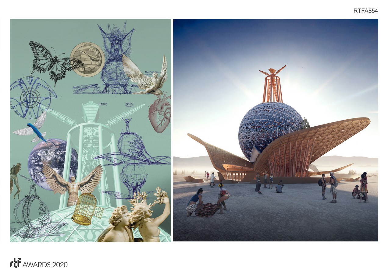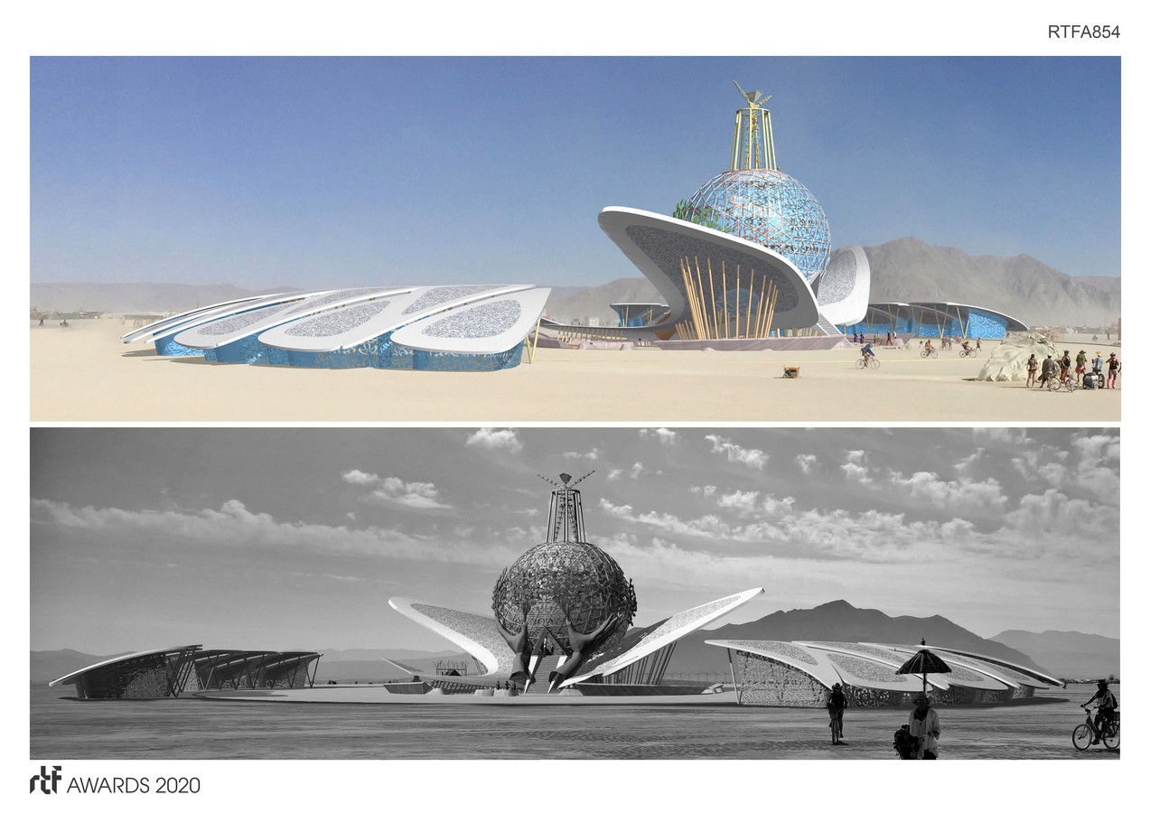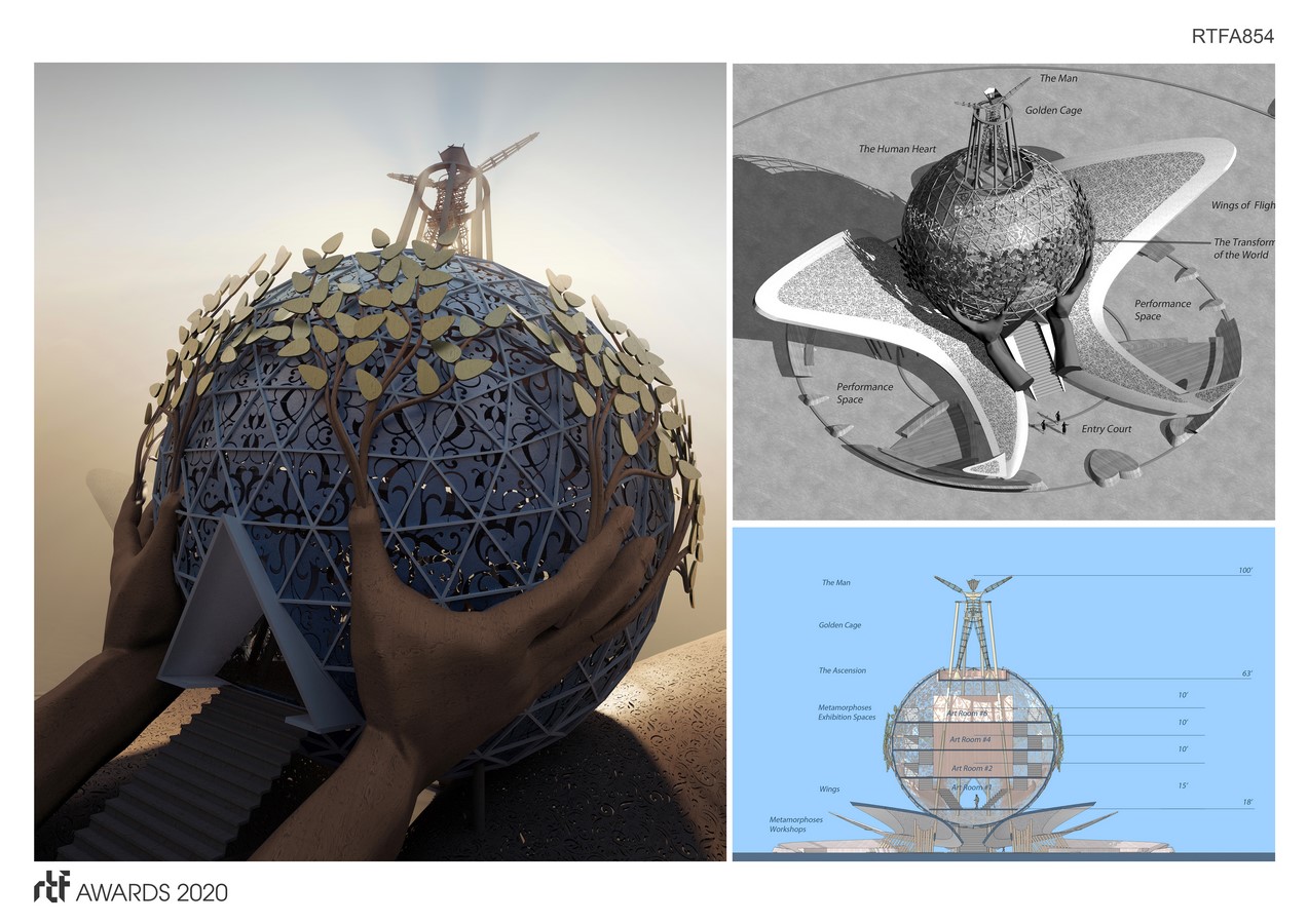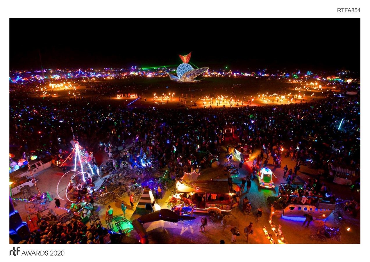 The rich and lyrical symbolism of Metamorphoses is the theme for this Burning Man base pavilion design in Black Rock City, Nevada. This design suggests an experience symbolizing the nature of Metamorphoses, of transformation, following a path of mystery and ambiguity. For the first time in its history, the Burning Man Organization held an invited design competition for the Man Base Pavilion.