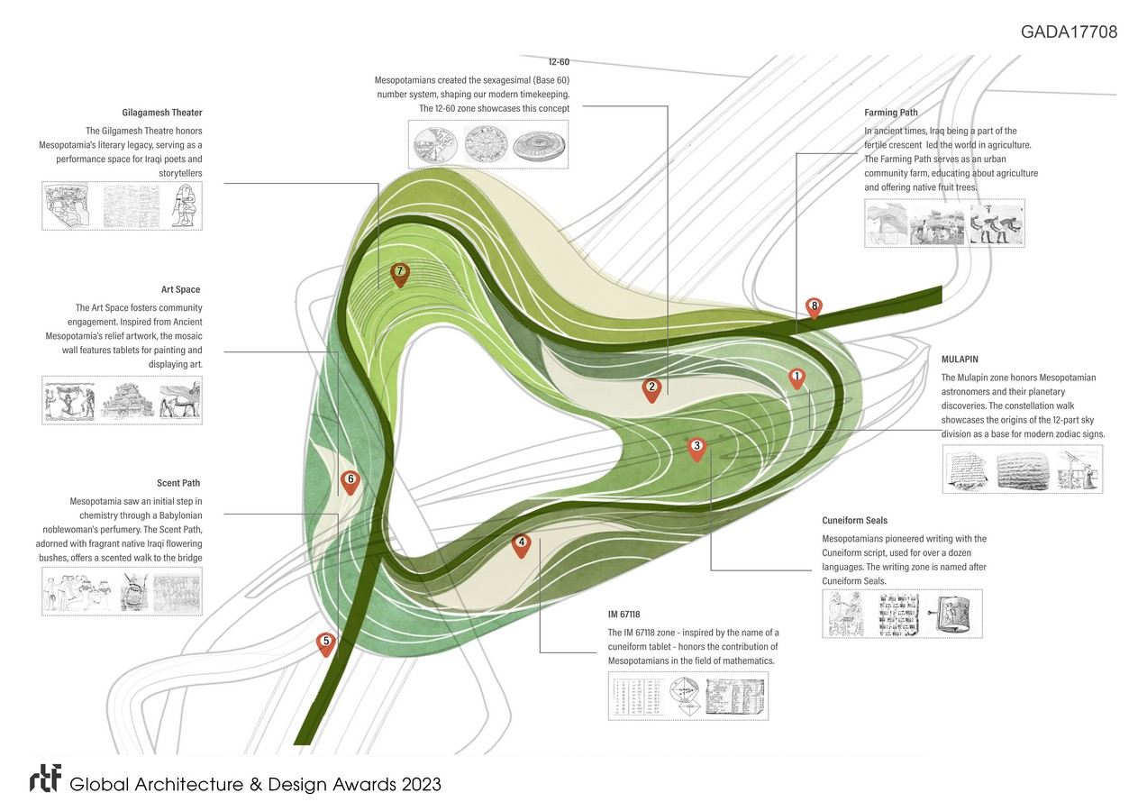 The design of the “Green Bridge of Baghdad” expands on the concept of a car/pedestrian bridge, by creating an urban public space that overlooks the Tigris river running underneath. The pedestrian bridge inspired by the shape of the heart and its different zones, forms a floating urban park that transforms the cityscape of Baghdad for its citizens. It comprises six distinct zones, each celebrating a unique aspect of Mesopotamian achievements and illuminating more than 3000 years of ancient legacy.