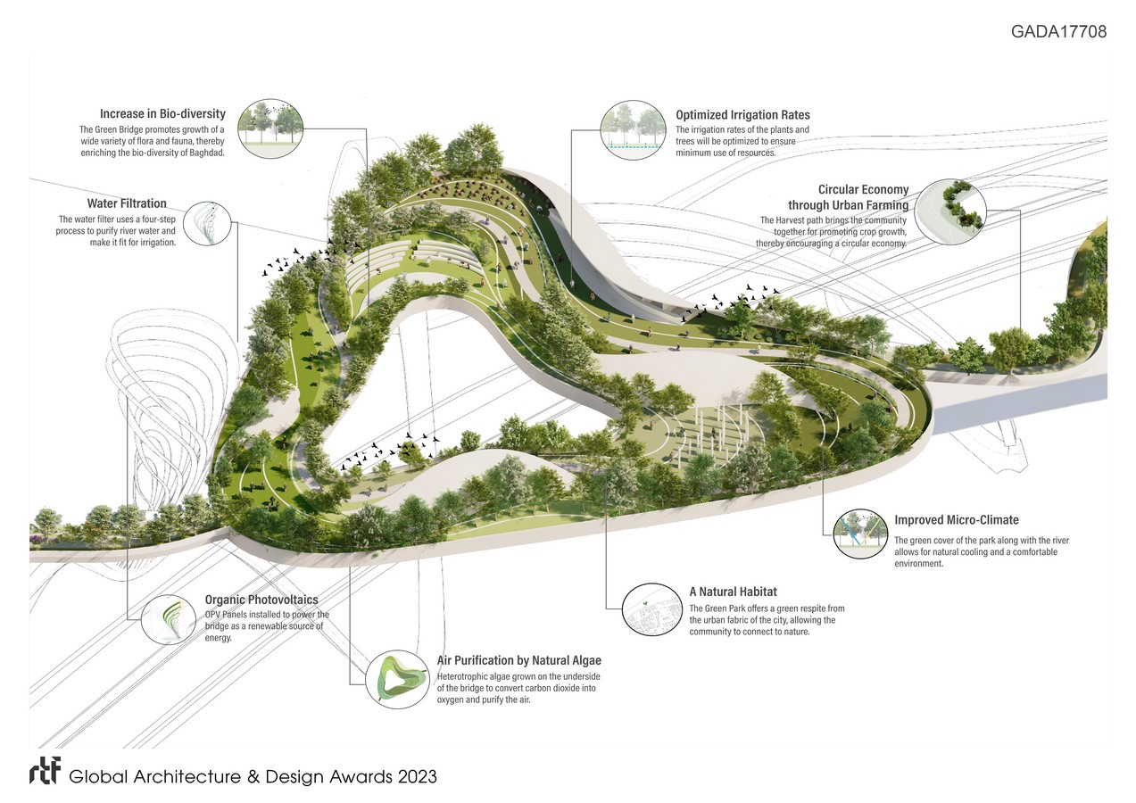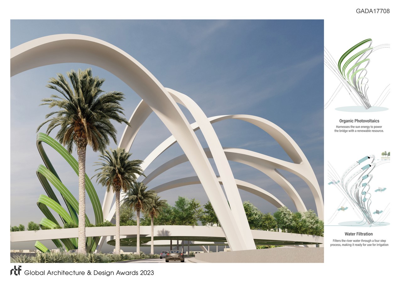 The bridge seamlessly integrates innovation and sustainability into its design. With water filters recycling Tigris river water for irrigation, and heterotrophic algae working as air purifiers, the bridge forms an ecosystem of its own for the community. Additionally, the installation of organic photovoltaic panels powers the bridge with a renewable source of energy.