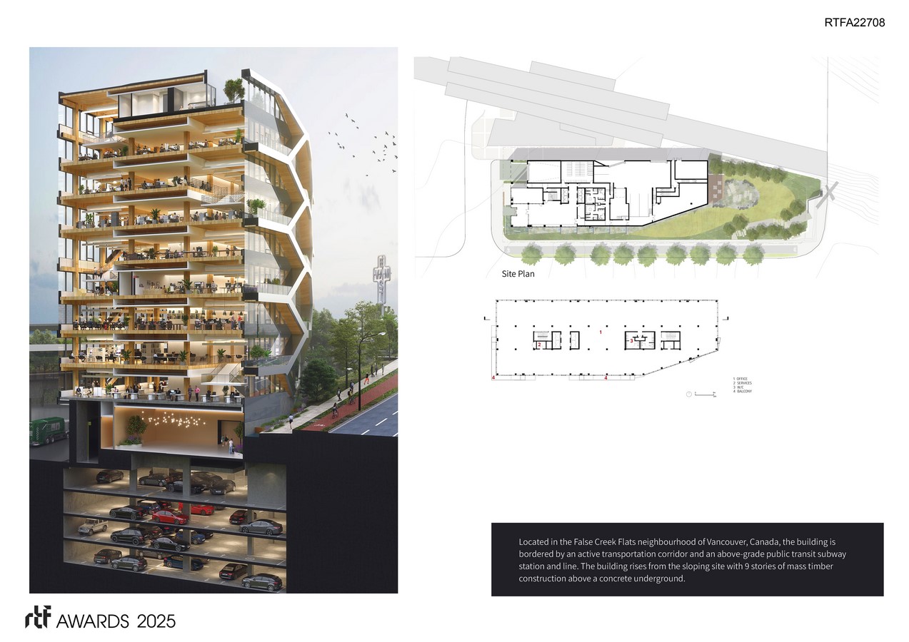The design is informed by three main factors: the sloping, narrow site, a series of right-of-ways restricting the footprint, and the architectural and structural vision to explore the potential of a structural system at the building’s perimeter. This frees up the inside floor plates and is expressed architecturally as a honeycomb-shaped exoskeleton. The design team made a conscious effort to respect the adjacent public art, Monument for East Vancouver, colloquially known as the East Van cross.