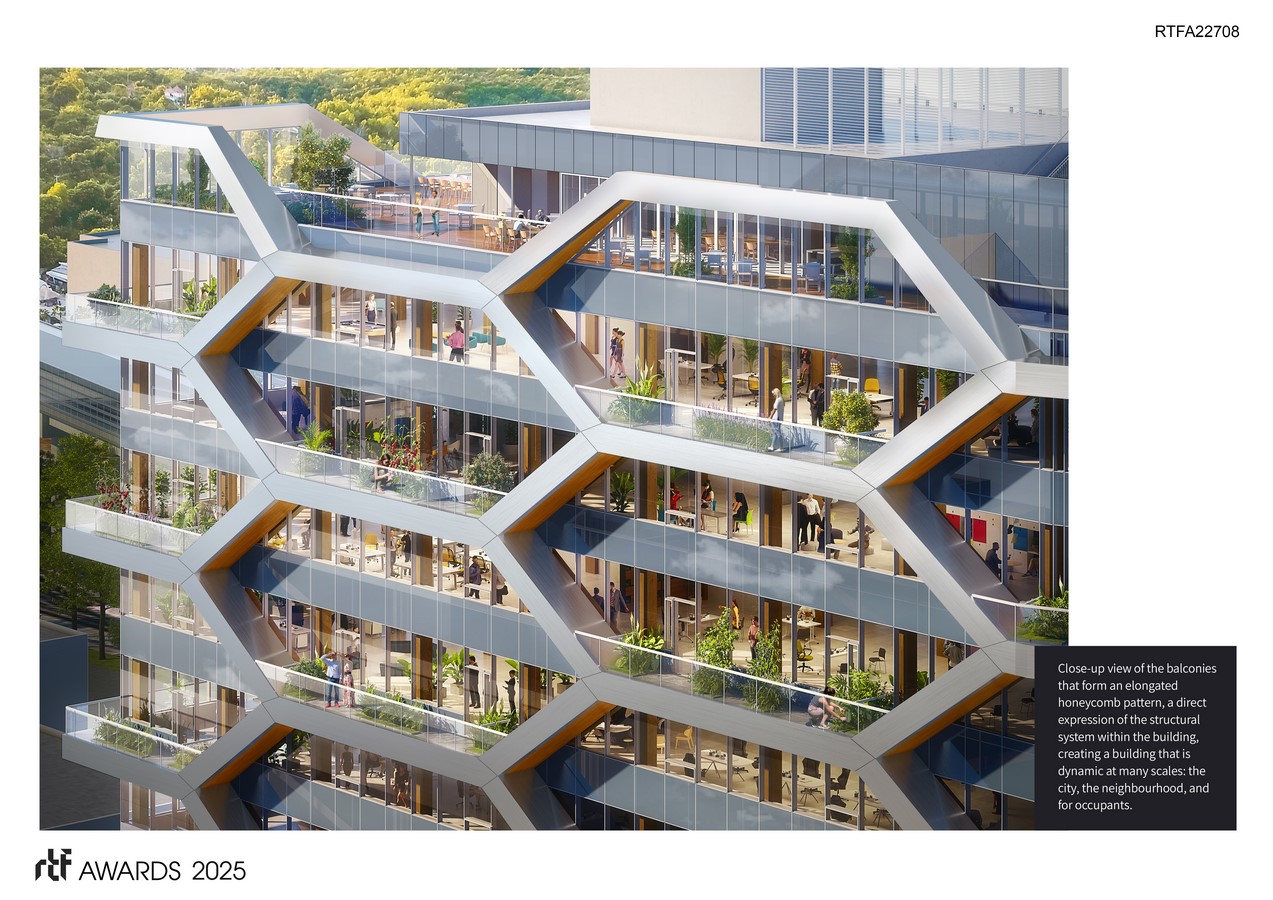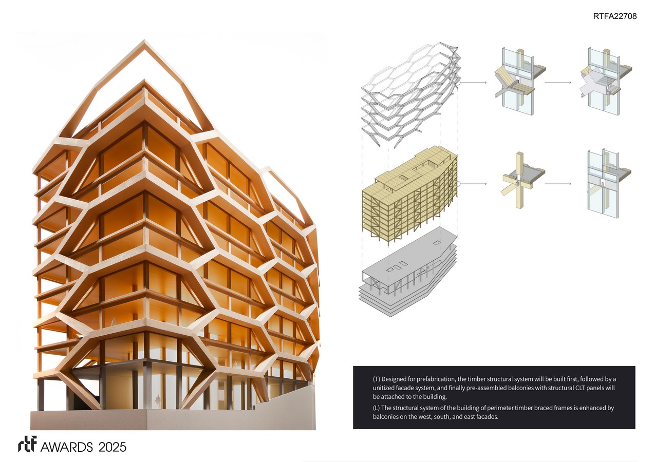 The Hive will consist of nine storeys of mass timber rising from a concrete ground level and an underground parkade. The architectural design features a unique engineered wood, perimeter-braced structural system, creating a bold, visually striking experience of the building. Balconies form an elongated honeycomb pattern, a direct expression of the structural system within the building, creating a building that is dynamic at many scales: the city, the neighbourhood, and for occupants.