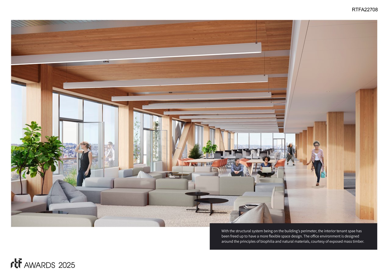 Other measures include high-efficiency heat recovery ventilation, air source heat pump heating and cooling systems, high-performance windows, and photovoltaic readiness. The building will run entirely on electricity. Each level will have access to outdoor space and balcony-integrated gardens and the main stair core is designed to encourage users to take the stairs. Occupants will benefit from an office environment designed around the principles of biophilia and natural materials, courtesy of exposed mass timber.