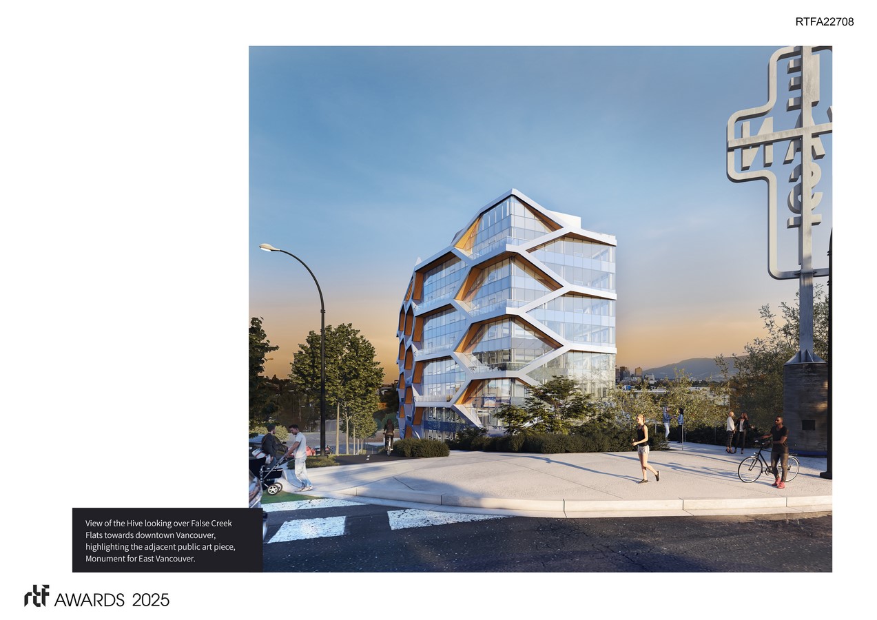 The Hive, with its iconic design, unique shape, and culturally significant location, will be the first thing people see when heading into downtown Vancouver through the Flats. It embodies innovation and reinvigoration, a demonstration of artful creativity paired with technical ingenuity towards a lower-carbon future.