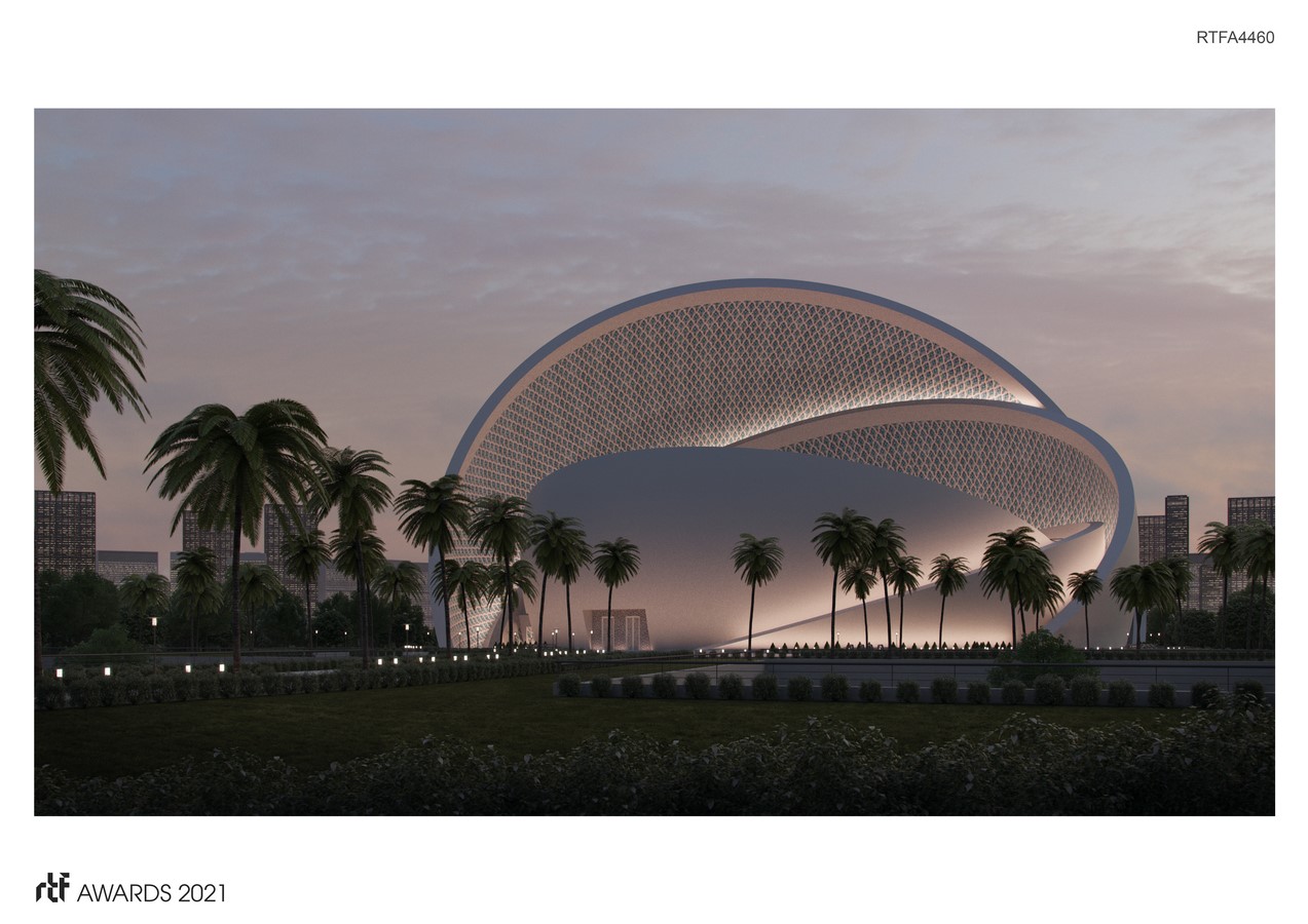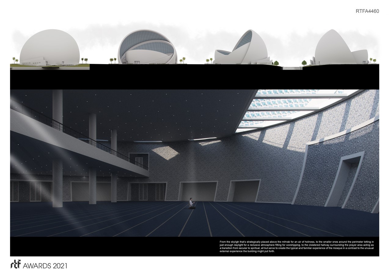 “Although the form isn’t of a typical mosque, it impeccably functions like one, satisfying the need for user segregation, directionality towards Mecca, and the most nuanced program requirements. Made up of layered shells, the largest one doubles as a dome typical in a mosque, also as a mihrab pointing towards Qibla, and a shield against thermal gain that shades the building. The resulting sculptural form will pose as a seashell, a pearl, or a monumental Mihrab all depending on the viewing angle while capturing the essence of Islamic architecture with its minimalist geometric character.”