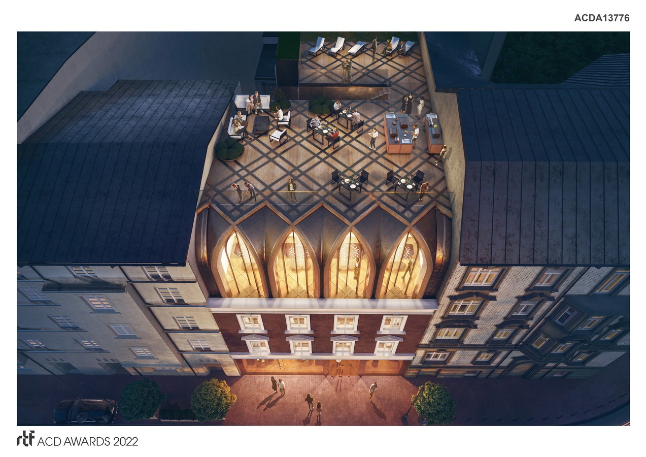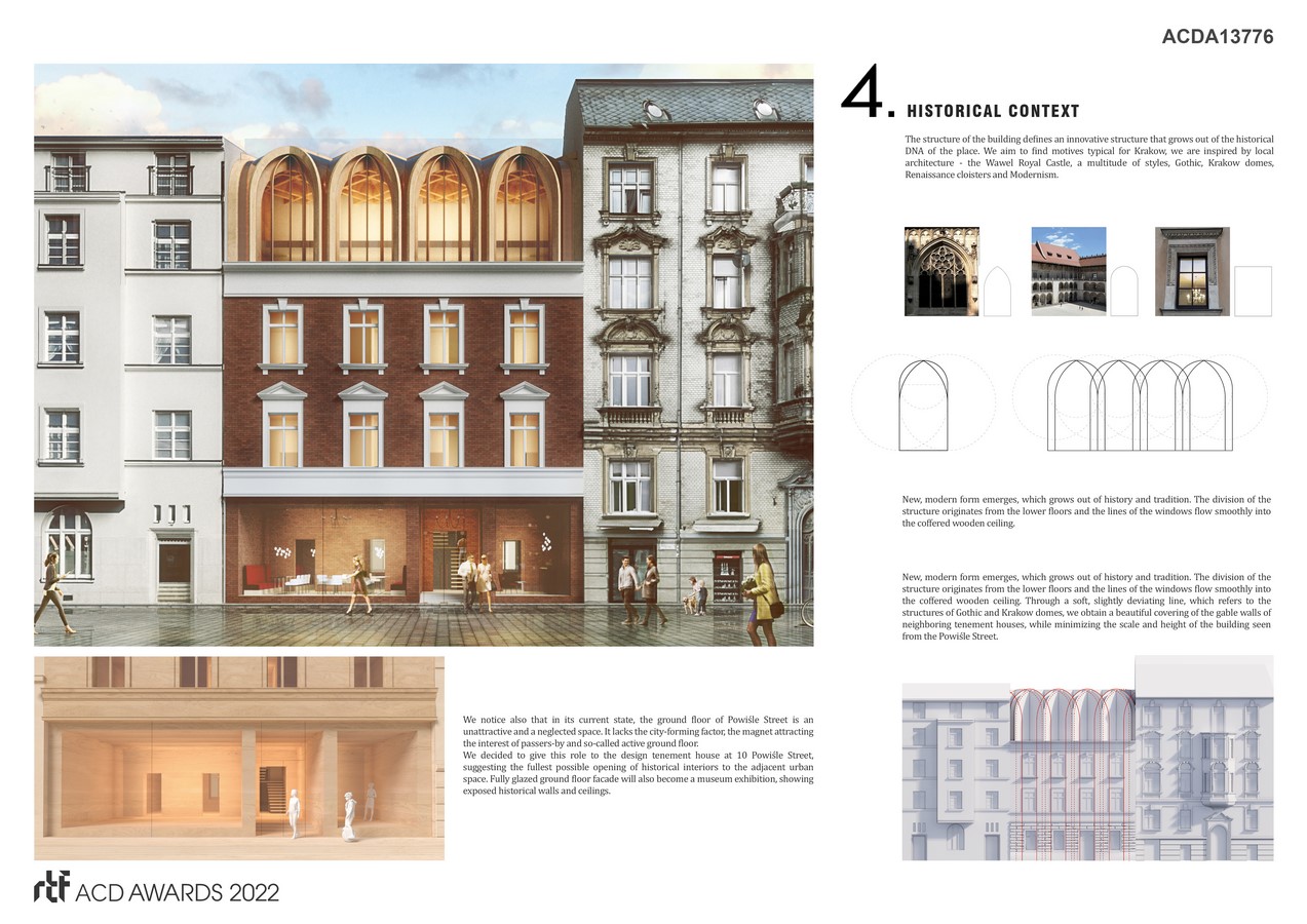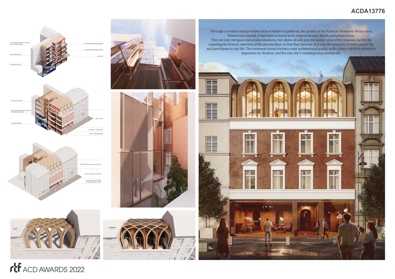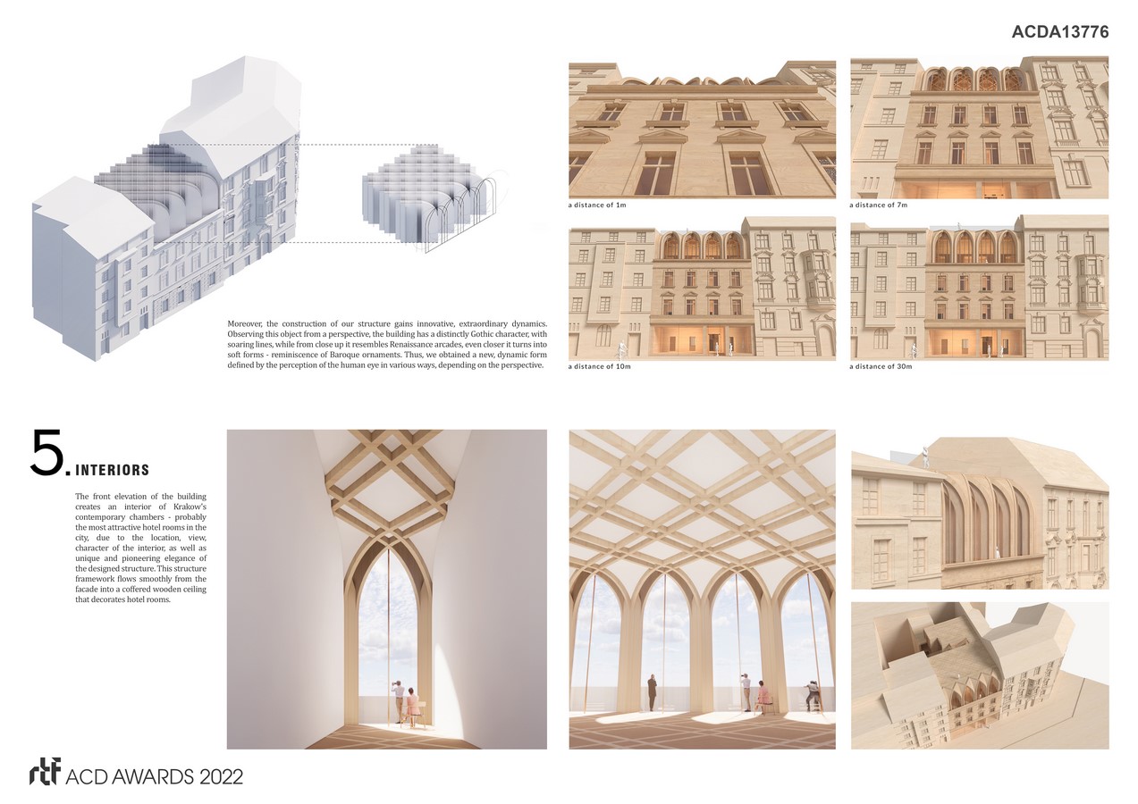 The structure of the building defines an innovative structure that grows out of the historical DNA of the place. We aim to find motives typical for Krakow, we are inspired by local architecture – the Wawel Royal Castle, a multitude of styles, Gothic, Krakow domes, Renaissance cloisters and Modernism. We use the most modern and enviromenmetally friendly technology – CLT glued timber construction, which will minimize the construction loads on the historical substance. New, modern form emerges, which grows out of history and tradition. The division of the structure originates from the lower floors and the lines of the windows flow smoothly into the coffered wooden ceiling. Through a soft, slightly deviating line, which refers to the structures of Gothic and Krakow domes, we obtain a beautiful covering of the gable walls of neighboring tenement houses, while minimizing the scale and height of the building seen from the Powiśle Street. Moreover, the construction of our structure gains innovative, extraordinary dynamics.
