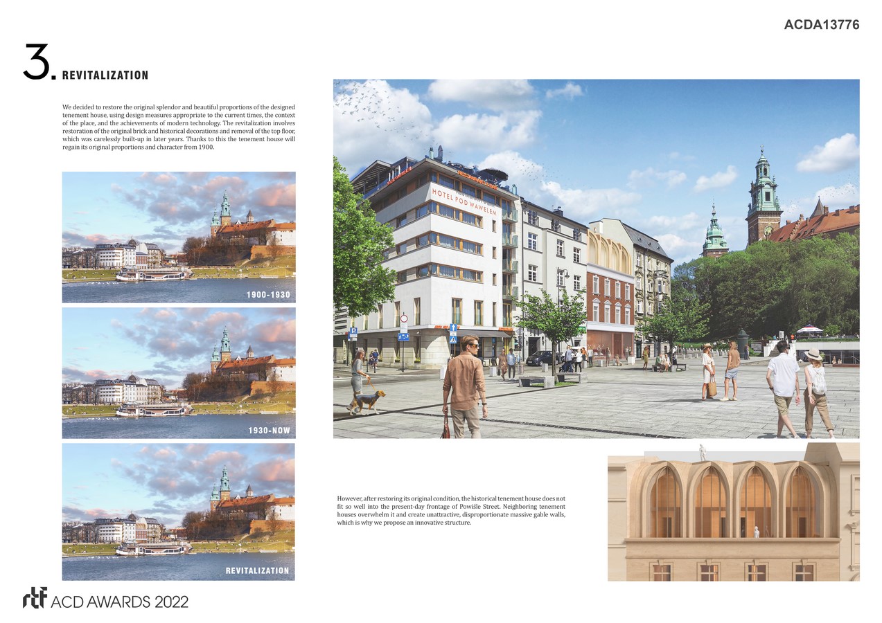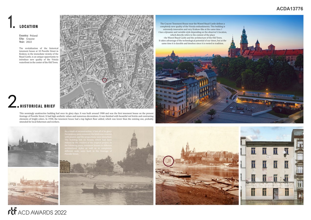 The revitalization of the historical tenement house at 10 Powiśle Street in Krakow, in the immediate vicinity of the Royal Castle, is an unique opportunity to introduce new quality of the Vistula waterfront in the center of the Old Town.