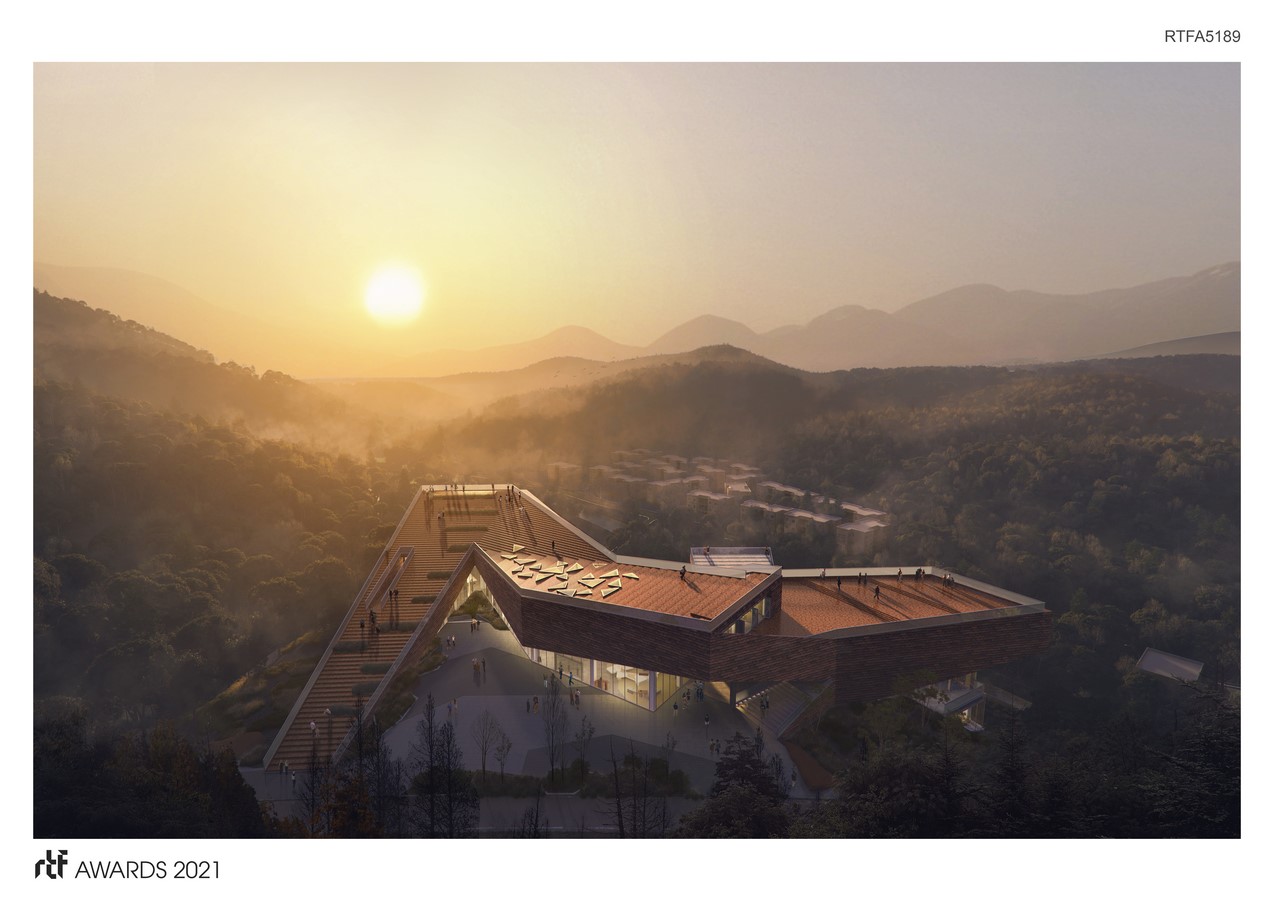 The main body of the building has four floors: The first floor distributed with model display area, audio-visual room, reception, unique restaurant and hotel exhibition hall. The second floor distributed with an aerial technology exhibition hall, multi-function hall/book bar/tea room and coffee shops. The roof is an open viewing platform, which can be used for sightseeing, photo shooting and other activities. It can achieve a 180-degree views of the surrounding and the scenery of the snow-capped mountains. The exterior platform shares the expansion function with the interior as well. Featured restaurants and geological and cultural exhibition halls distributed on the basement level.