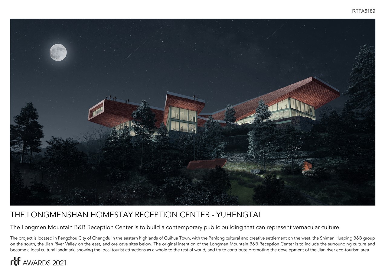 The project is located in Pengzhou City of Chengdu in the eastern highlands of Guihua Town, with the Panlong cultural and creative settlement on the west, the Shimen Huaping B&B group on the south, the Jian River Valley on the east, and ore cave sites below. The original intention of the Longmen Mountain B&B Reception Center is to include the surrounding culture and become a local cultural landmark, showing the local tourist attractions as a whole to the rest of world, and try to contribute promoting the development of the Jian river eco-tourism area.