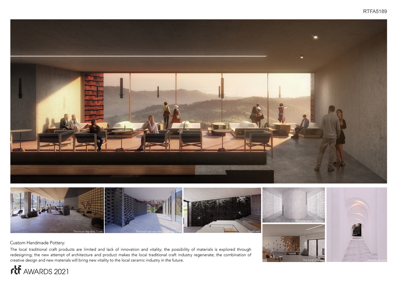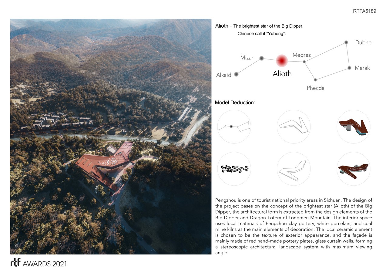 Pengzhou is one of tourist national priority areas in Sichuan. The design of the project bases on the concept of the brightest star (Alioth) of the Big Dipper, the architectural form is extracted from the design elements of the Big Dipper and Dragon Totem of Longmen Mountain. The interior space uses local materials of Pengzhou clay pottery, white porcelain, and coal mine kilns as the main elements of decoration. The local ceramic element is chosen to be the texture of exterior appearance, and the façade is mainly made of red hand-made pottery plates, glass curtain walls, forming a stereoscopic architectural landscape system with maximum viewing angle.
