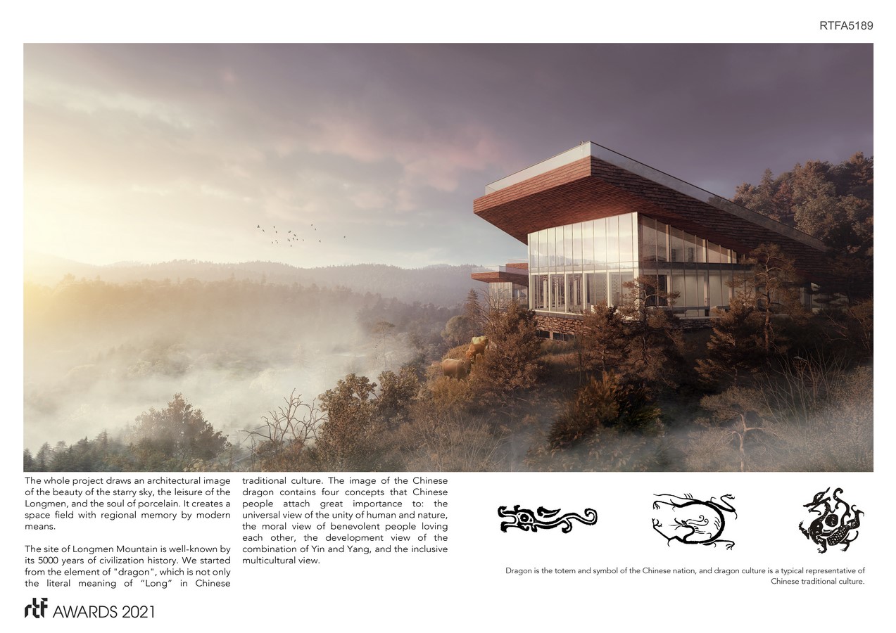 The site of Longmen Mountain is well-known by its 5000 years of civilization history. We started from the element of “dragon”, which is not only the literal meaning of “Long” in Chinese responding to the name of Longmen Mountain, but also a typical representative of Chinese traditional culture. The image of the Chinese dragon contains four concepts that Chinese people attach great importance to: the universal view of the unity of human and nature, the moral view of benevolent people loving each other, the development view of the combination of Yin and Yang, and the inclusive multicultural view.