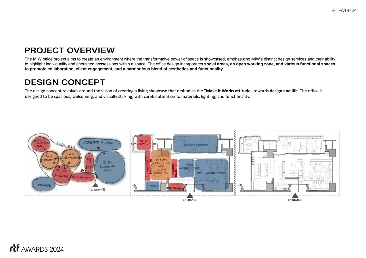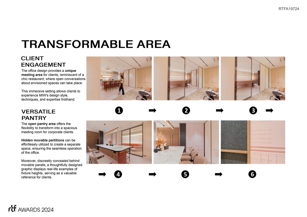 The MIW office project is designed to showcase the transformative power of space. It incorporates dedicated social areas, an open working zone, and functional spaces that encourage collaboration and client engagement. The design strikes a careful balance between aesthetics and functionality, ensuring that the office is visually striking while also being highly practical.