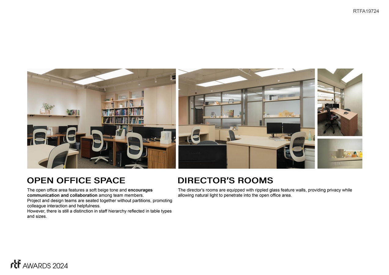 Key design elements of the MIW office include dedicated social areas where employees can relax and connect, a unique meeting area designed specifically for client interactions, and the use of materials that create a warm and inviting atmosphere. The open office space is designed to facilitate communication and collaboration, while director’s rooms feature rippled glass feature walls that add a touch of elegance and privacy.