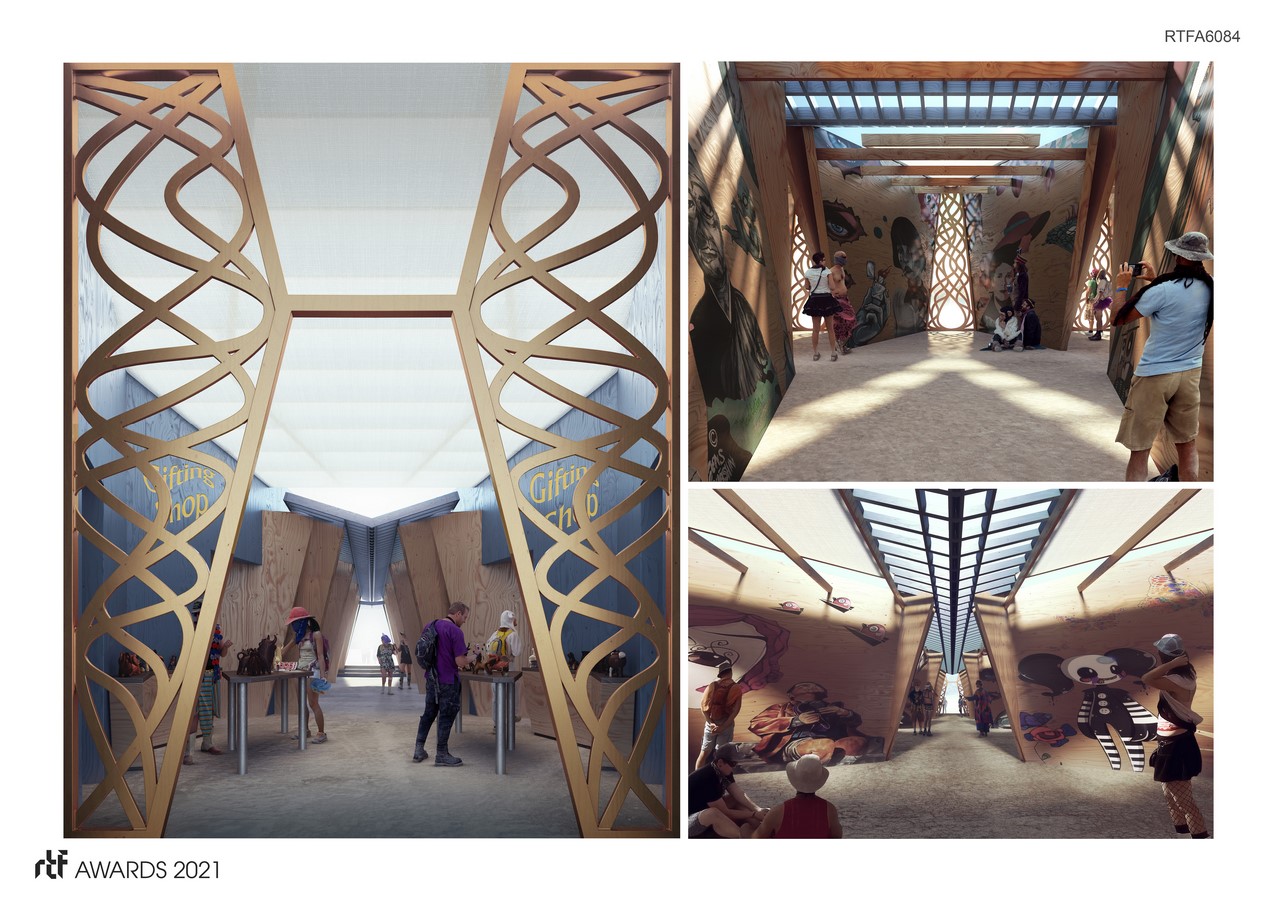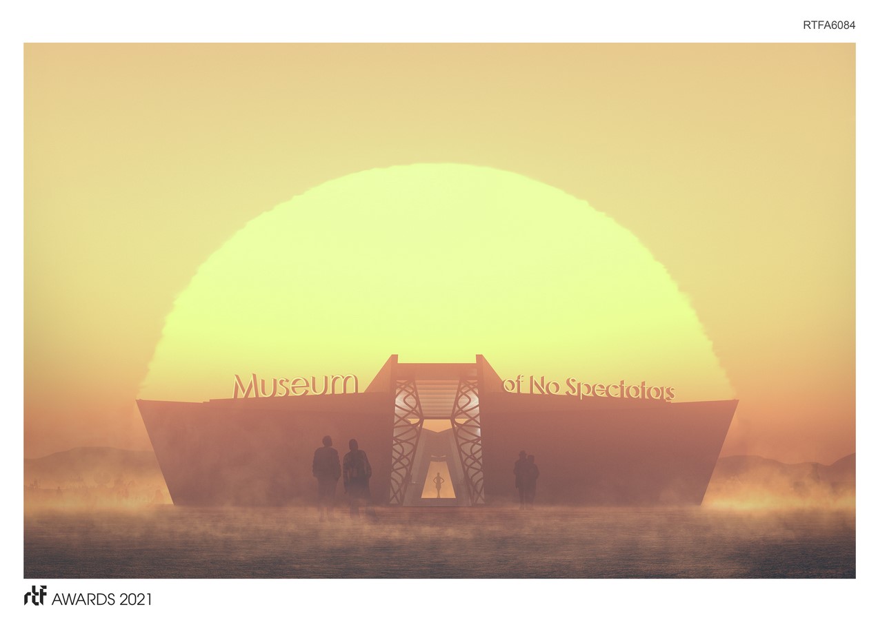 Out near the dusty perimeter of Black Rock City lies a different kind of museum. As you approach this intriguing and mysterious building with its unusually shaped galleries, appearing part machine, part creature, part abstract and surrealistic form, it may present as a blank slate, with an expansive exterior, the letters spelling Museum of No Spectators hovering above. Its dynamic shapes emerge as otherworldly yet grounded. It is waiting for you to approach and become a part of it….. to participate.
