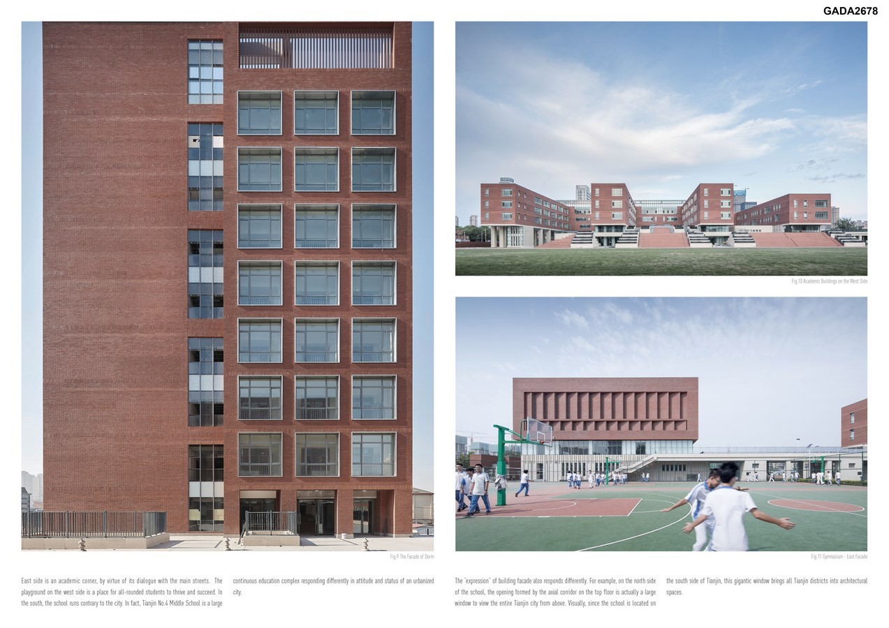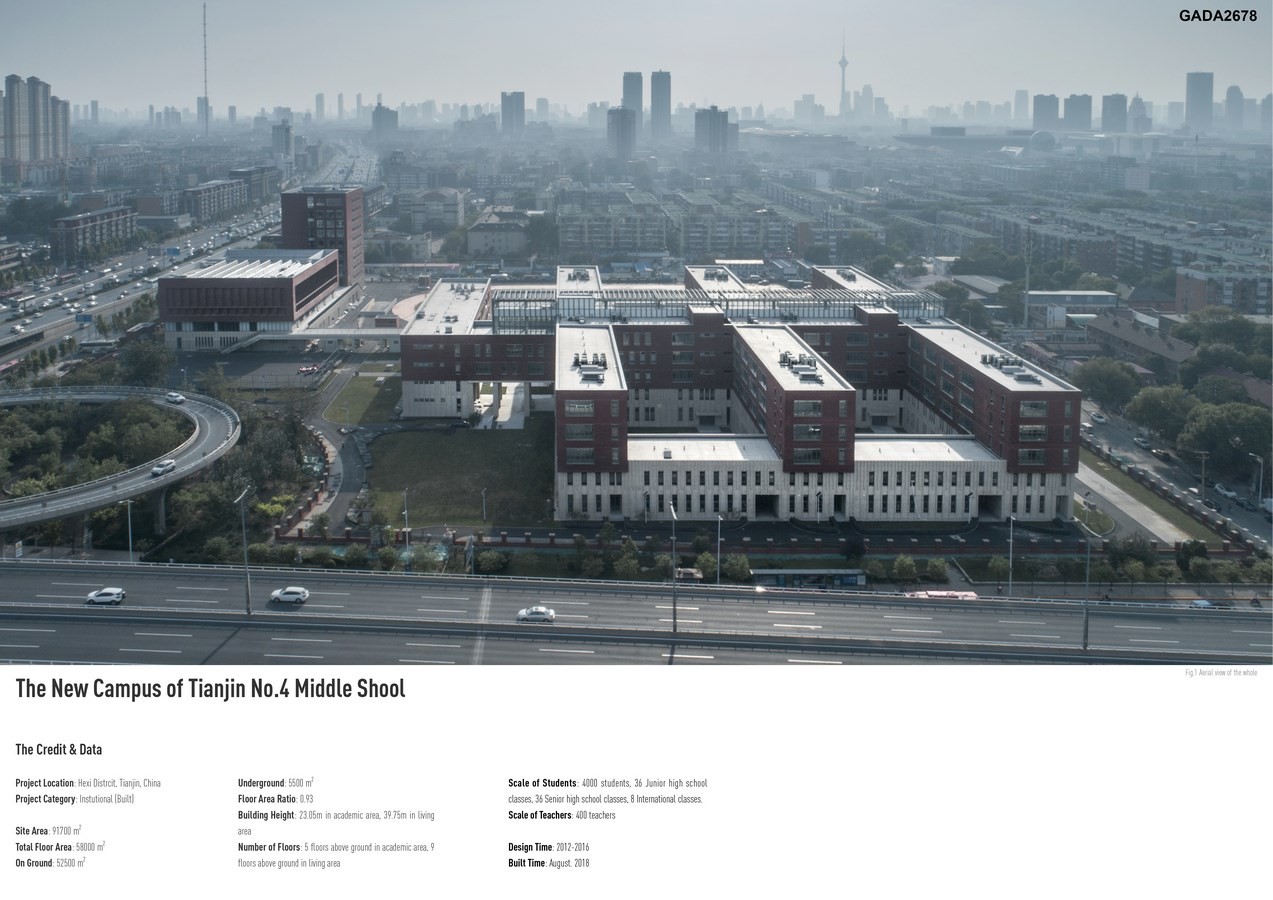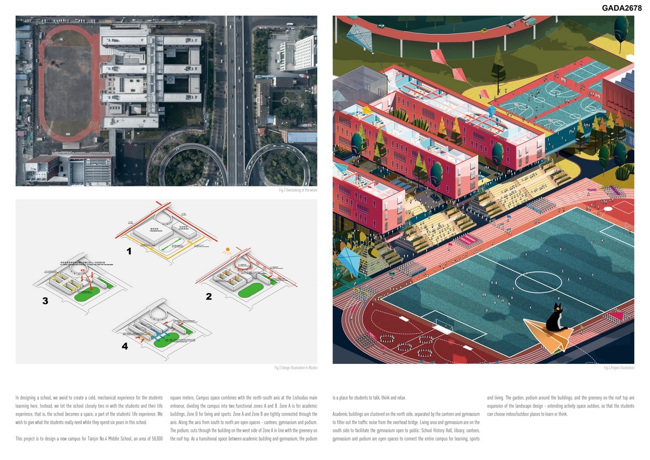 This project is to design a new campus for Tianjin No.4 Middle School, an area of 58,000 square meters. Campus space combines with the north-south axis at the Lishuidao main entrance, dividing the campus into two functional zones A and B. Zone A is for academic buildings, Zone B for living and sports.