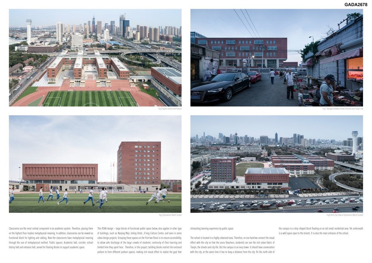 The school is located in a highly urbanized area. Therefore, we connect the visual effect with the city so that the users can see the rich urban fabric of Tianjin, the streets and city life. But the campus is an ivory tower. It should have conversation with the city, meanwhile it has to keep a distance from the city. In the south of the campus is a strip-shaped block floating on an old small residential area. Yet underneath is a wild space open to the streets. It is also the main entrance of the school.