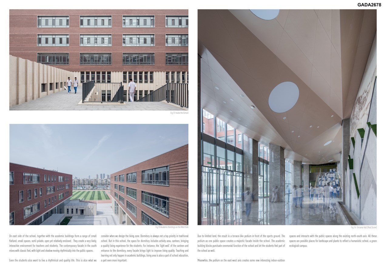 Due to limited land, the result is a terrace-like podium in front of the sports ground. The podium as one public space creates a majestic facade inside the school. The academic building blocks punctuate ceremonial function of the school and let the students feel part of the school as well. Meanwhile, the podium on the east-west axis creates some new interesting indoor-outdoor spaces and interacts with the public spaces along the existing north-south axis. All these spaces are possible places for landscape and plants to reflect a humanistic school, a green ecological campus.