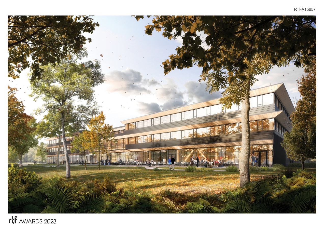 The architecture is inspired by WELL and Passive House design standards and promotes health and wellness at every level, prioritizing democratic access to light and views as well as access to outdoor space and communal connection to the ravine. The exposed timber environment, beyond the commitment to renewable, carbon sequestering construction, creates an enveloping connection to nature in the daily life of the employees.