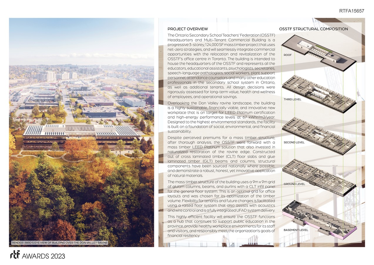 The Ontario Secondary School Teachers’ Federation (OSSTF) Headquarters and Multi-Tenant Commercial Building is a progressive 3-storey, 124,000 SF mass timber project that uses net-zero strategies, and will seamlessly integrate commercial opportunities with the relocation and revitalization of the OSSTF’s office centre in Toronto.