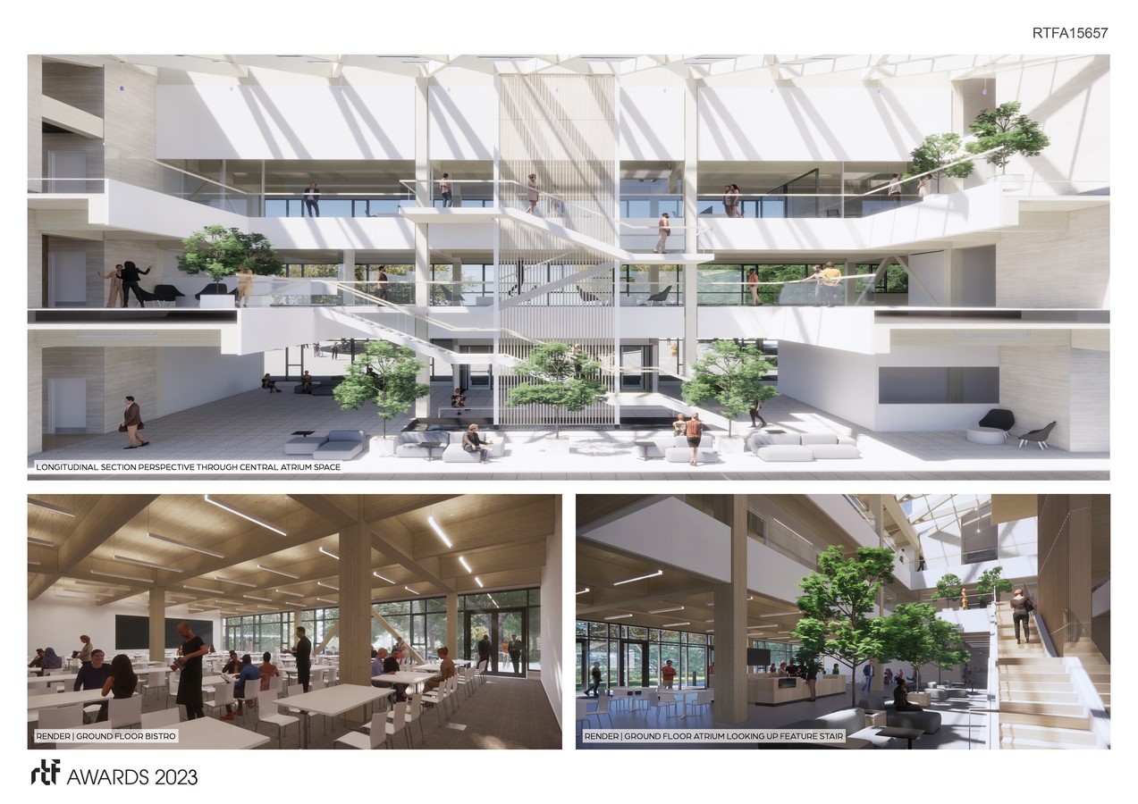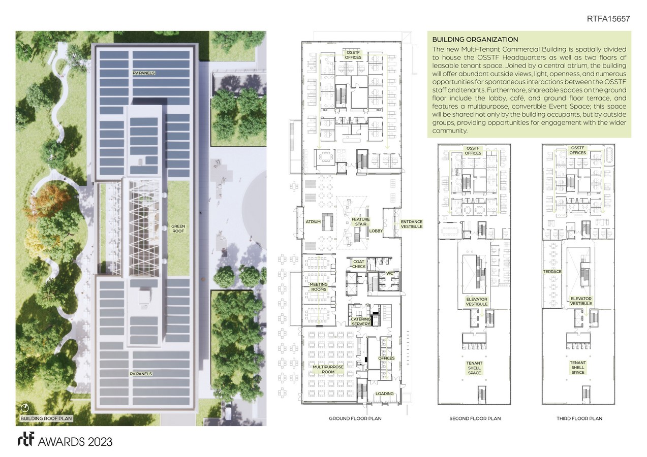 The new Multi-Tenant Commercial Building is spatially divided to house the OSSTF Headquarters as well as two floors of leasable tenant space. Joined by a central atrium, the building will offer abundant outside views, light, openness, and numerous opportunities for spontaneous interactions between the OSSTF staff and tenants. Furthermore, shareable spaces on the ground floor include the lobby, café, and ground floor terrace, and features a multipurpose, convertible Event Space; this space will be shared not only by the building occupants, but by outside groups, providing opportunities for engagement with the wider community.