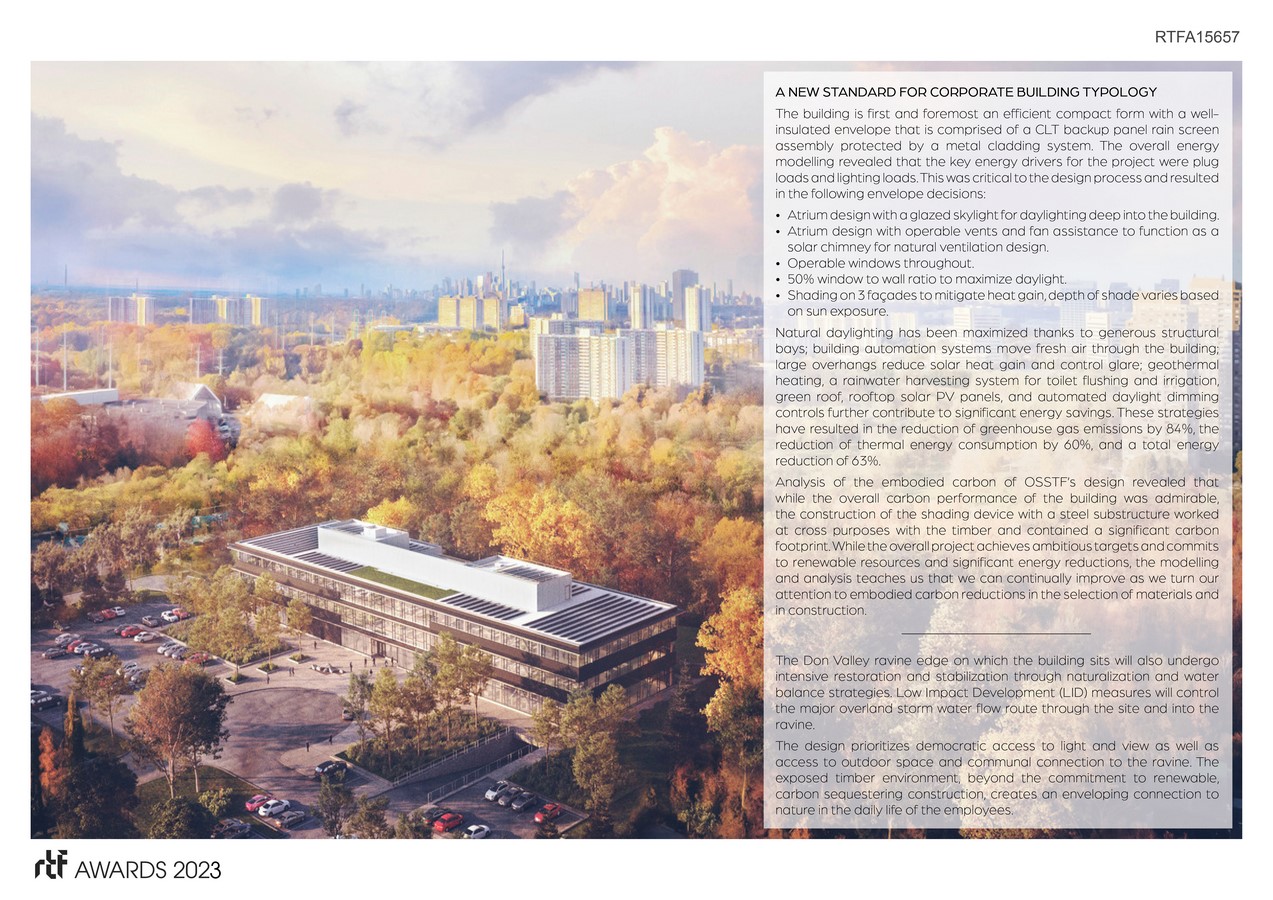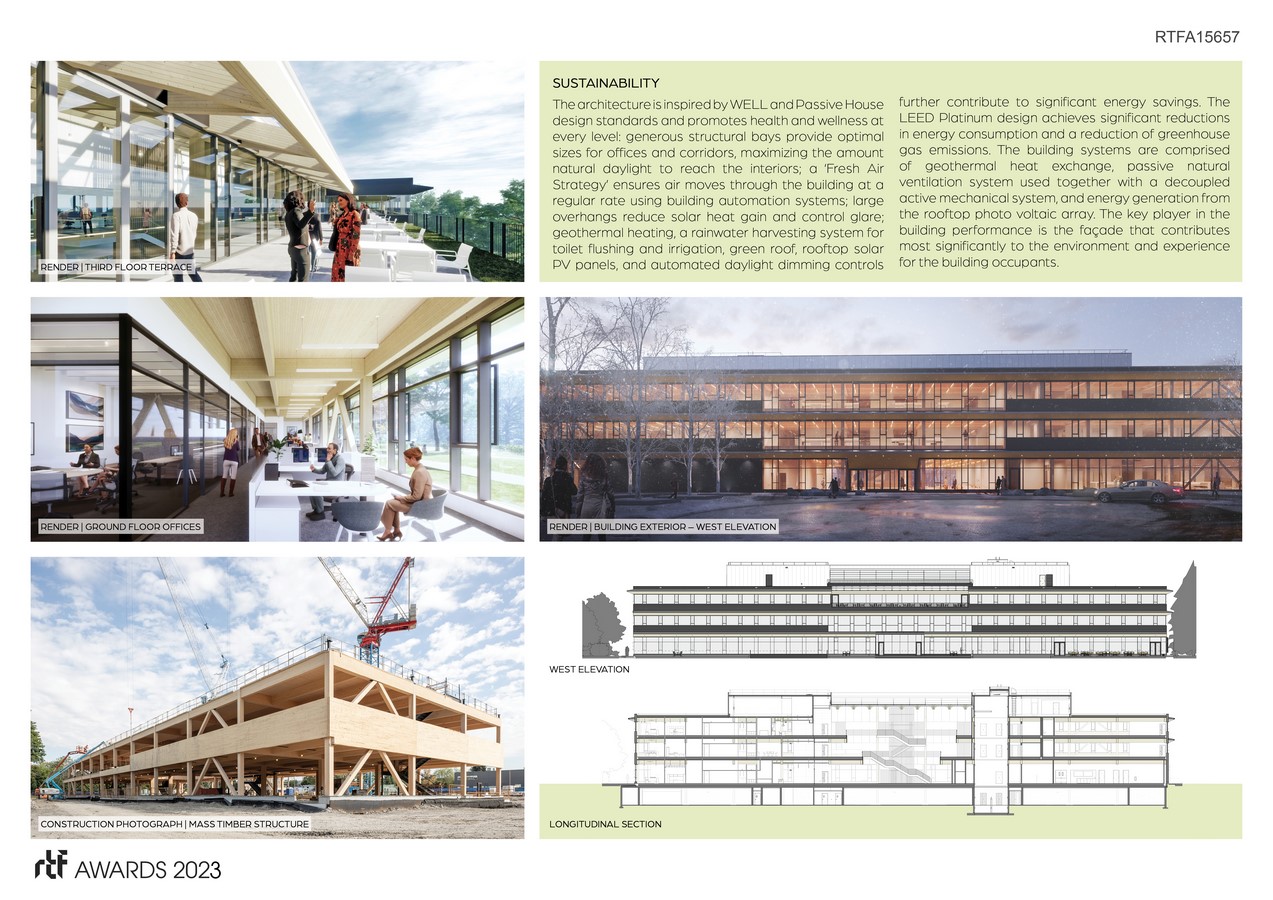 Overlooking the Don Valley ravine landscape, the building is a highly sustainable, financially viable, and innovative new workplace that is on target for LEED Platinum certification and high-energy performance levels at 67 kWhr/m2/year. Designed to the highest environmental standards, the facility is built on a foundation of social, environmental, and financial sustainability.
