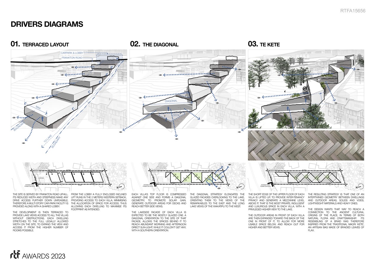 The site is served by Frankton Road uphill. its reduced width and steepness make any drive access further down unfeasible, therefore a multi story car-park facility is provided along with a shared lobby.