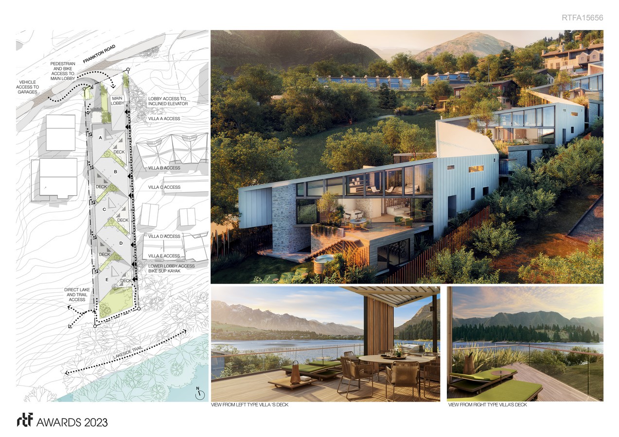 The diagonal strategy elongates the glazed facades overlooking to the lake, orienting them to the views of the Remarkables to the east and the long lake views of the Wakatipu to the west.