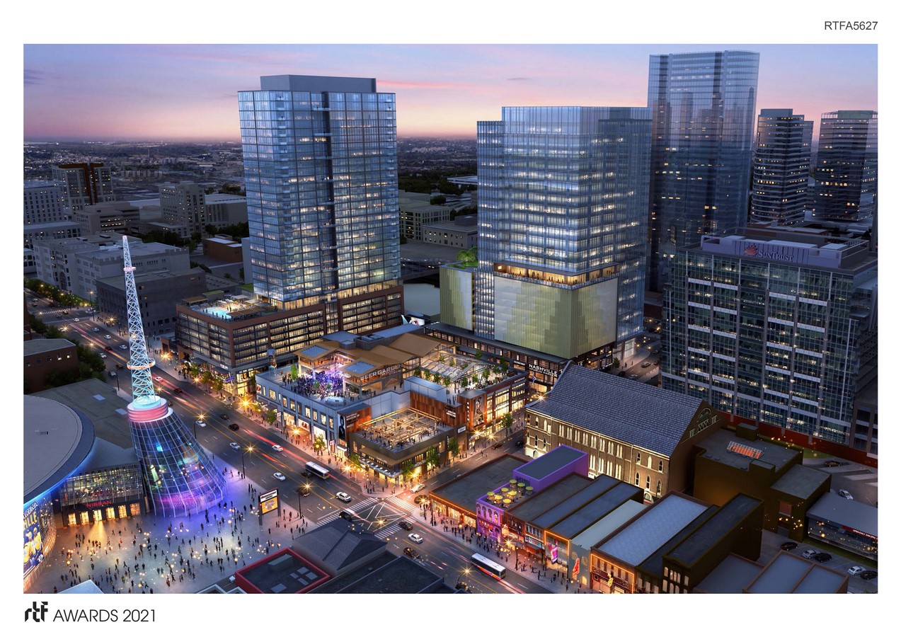 The Place at 5th and Broadway is a dynamic and new story multi-family housing development tower located at the end of Honky Tonk Row and across from The Ryman Auditorium and The Bridgestone Arena. It is the tallest apartment tower in the state of Tennessee, featuring an exterior glass feature with dramatic tile mosaic spanning its full length.