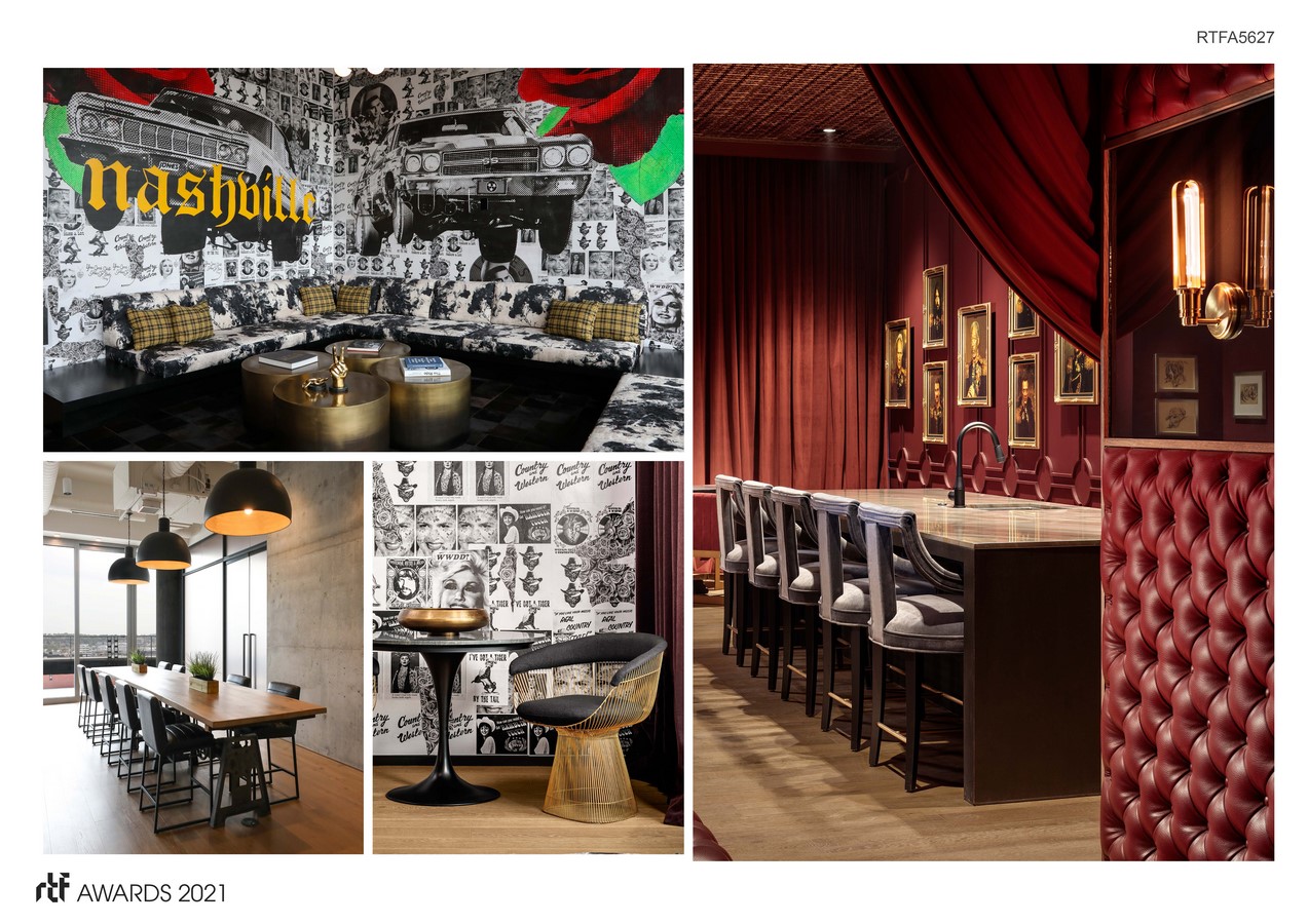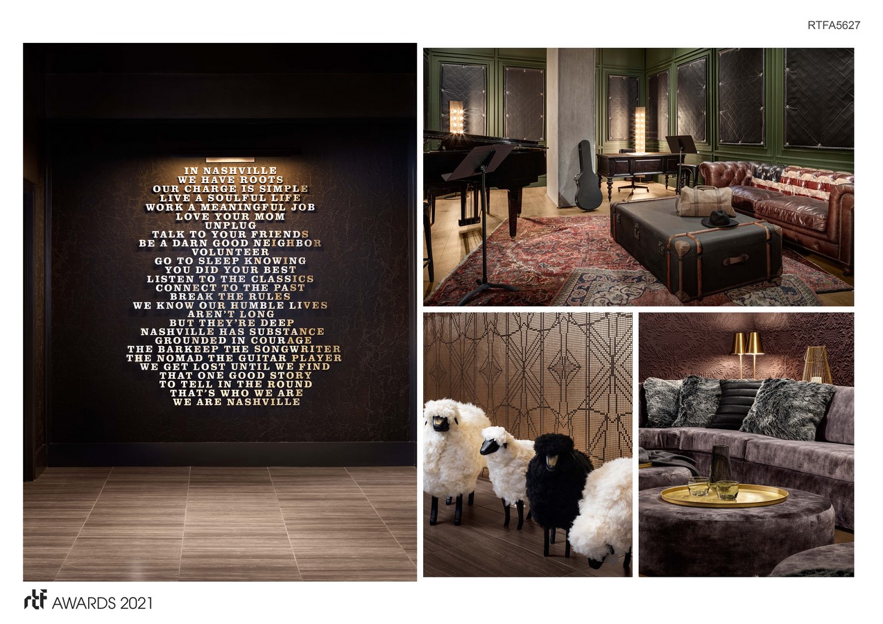 The “rock-and-roll meets luxury” chic aesthetic visually connects the public and private spaces throughout the building, showcasing rare unseen photographs and behind-the-scene moments from famous musicians, offering a subtle nod to the artistic spirit of “Music City, USA”.