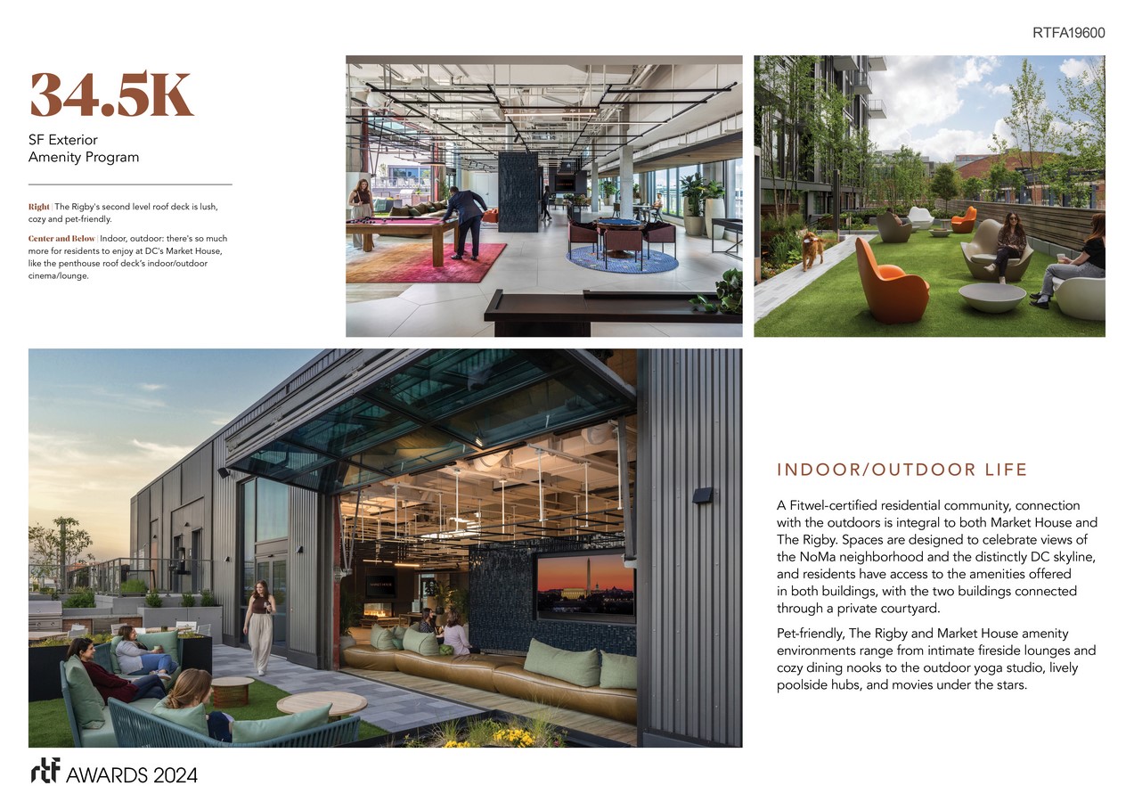 A Fitwel-certified residential community, connection with the outdoors is integral to both Market House and The Rigby. Spaces are designed to celebrate views of the NoMa neighborhood and the distinctly DC skyline, and residents have access to the amenities offered in both buildings, with the two buildings connected through a private courtyard. Pet-friendly, The Rigby and Market House outdoor environments range from intimate fireside lounges and cozy dining nooks to an outdoor yoga studio, lively poolside hubs, and a movie lounge under the stars.