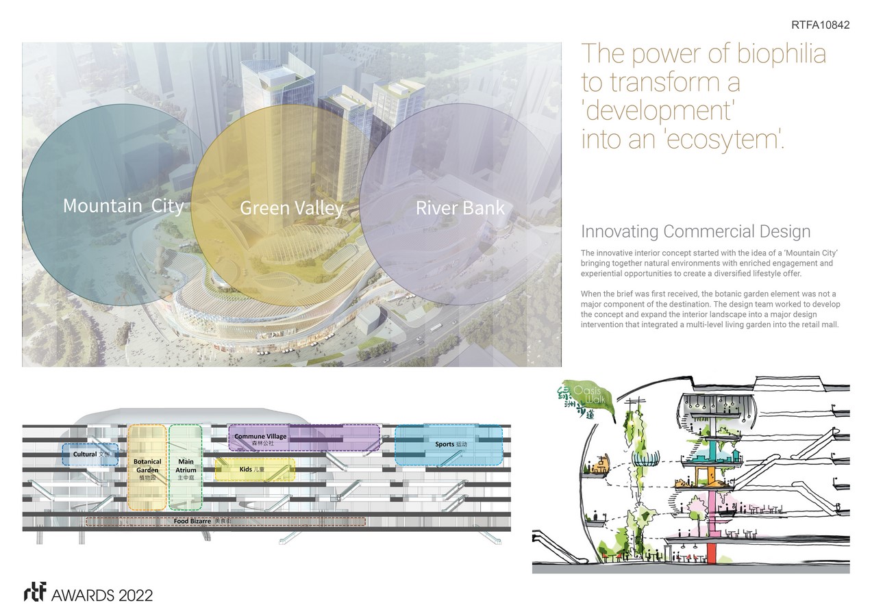 The scheme aims to set a new benchmark for experiential destinations in China. Truly innovative, the vision seeks to deliver a new-generation social destination, an urban natural community, and a landmark regional commercial centre. The power of biophilia is front and centre, pushing the agenda forward for future commercial developments.