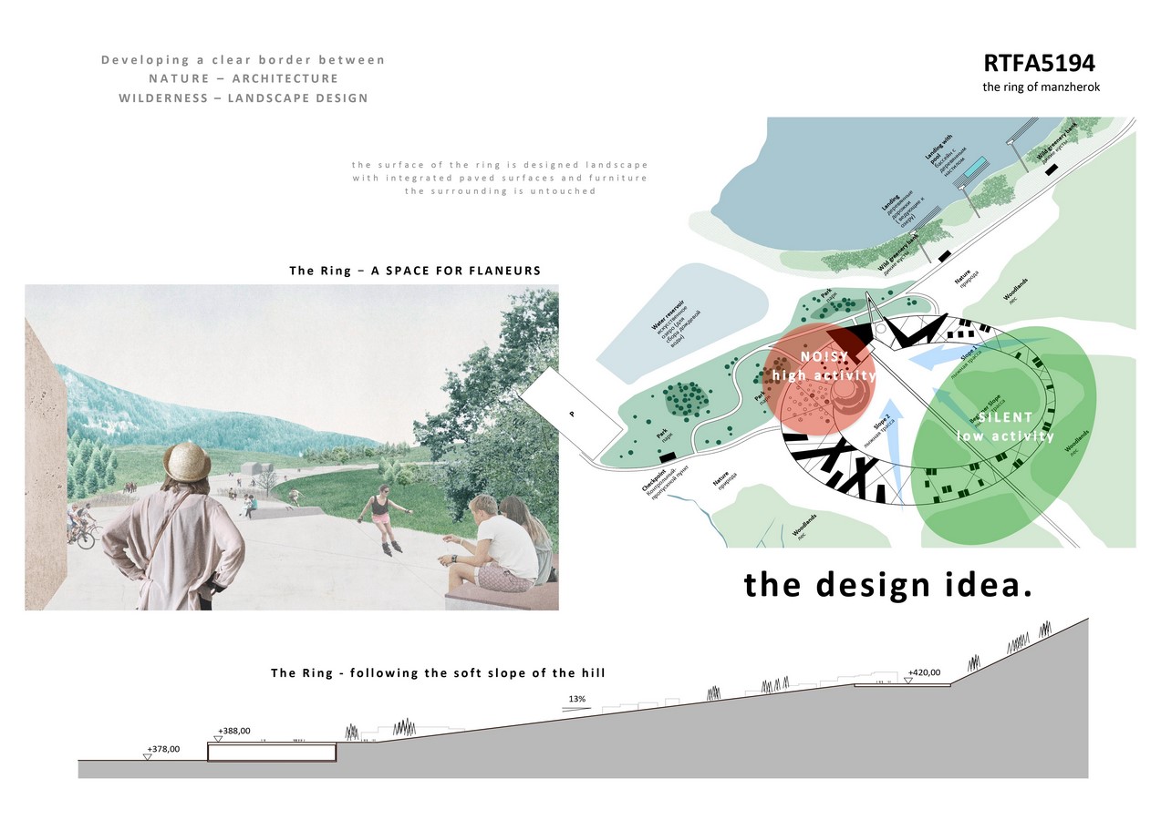 This footprint or ‘building zone’ is programmed as a pedestrian zone with only electric carts for infrastructural care and disposal. the ring is tilted according to the slope of the mountain. In the lower part, it becomes a building structure itself and is bridging the existing levels.