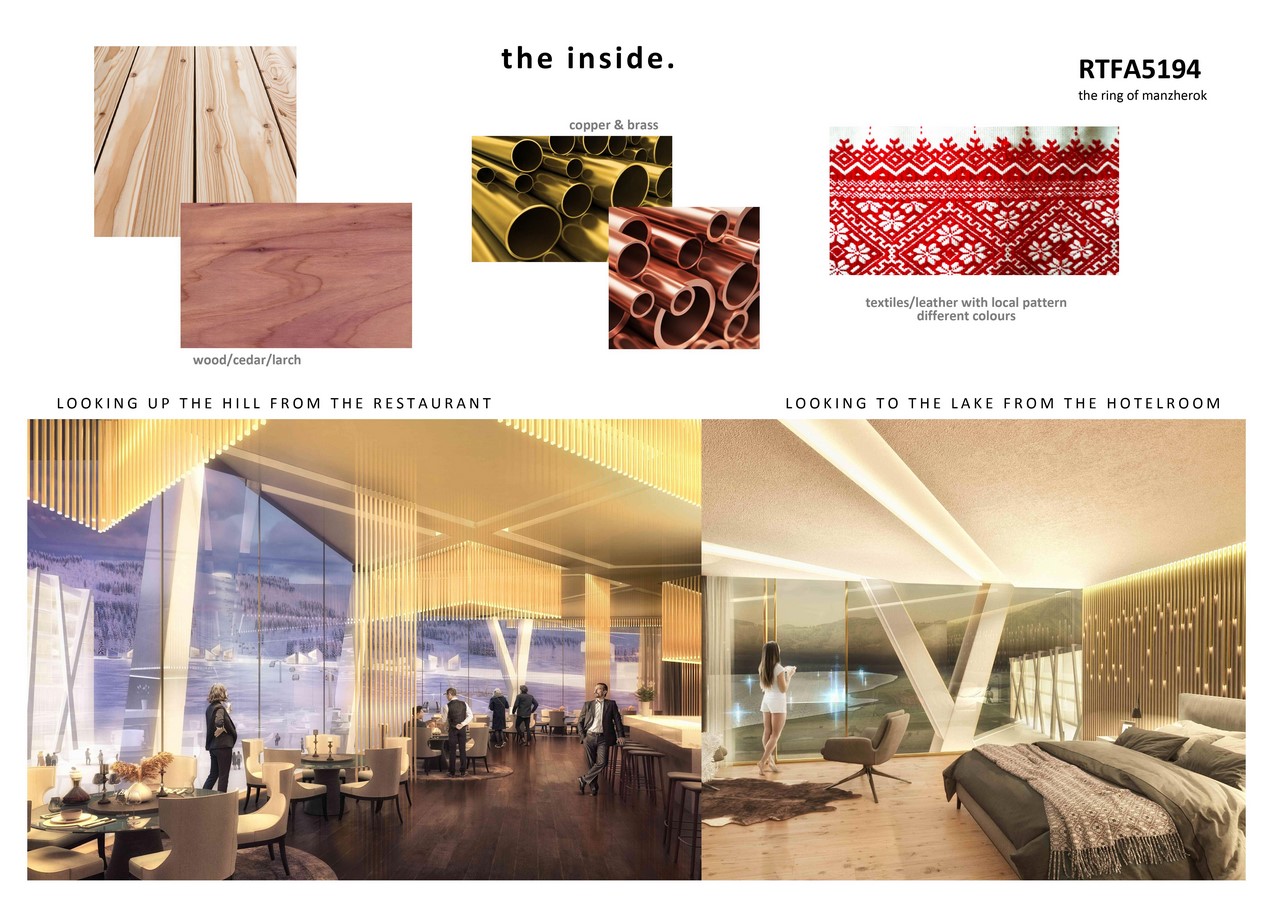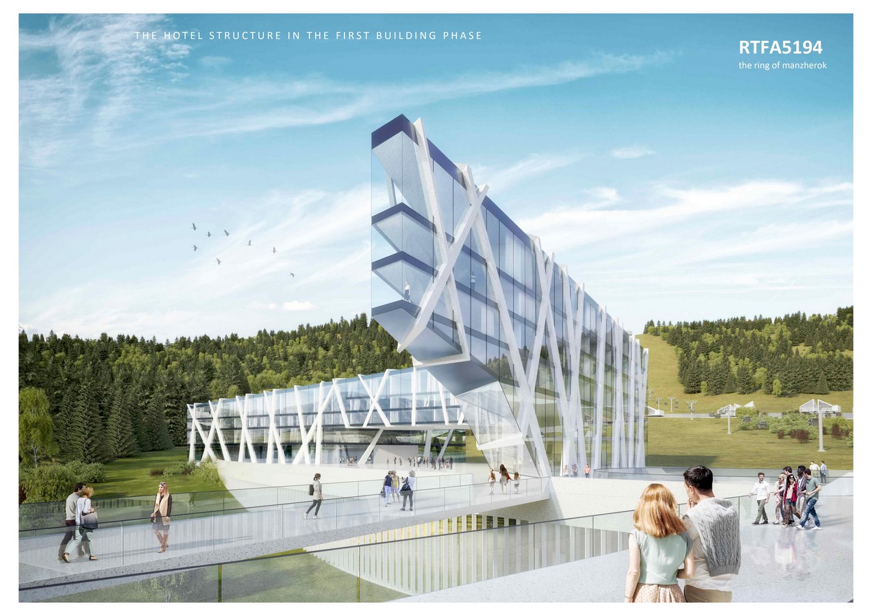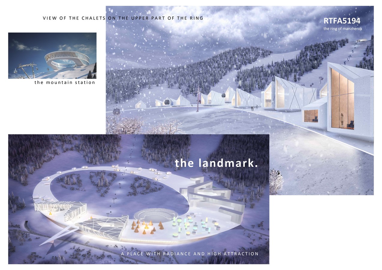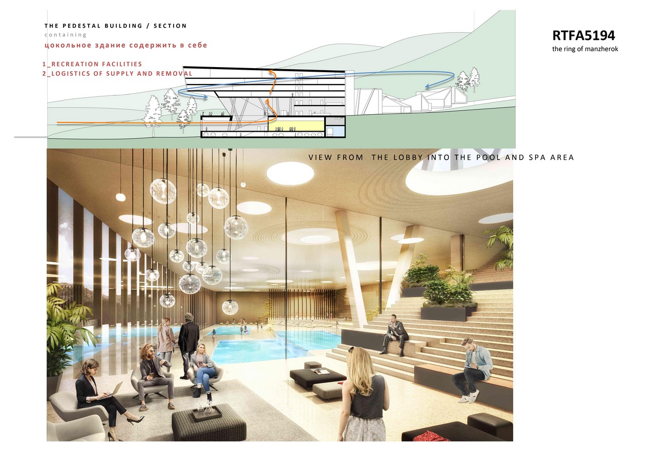 The building on the rings surface is configured in different zones. From the high activity zone (restaurants, shopping, gondola station, bigger hotel and apartment structures) to the low activity zone (chalets with single or double occupation, wellness and sauna huts etc)
