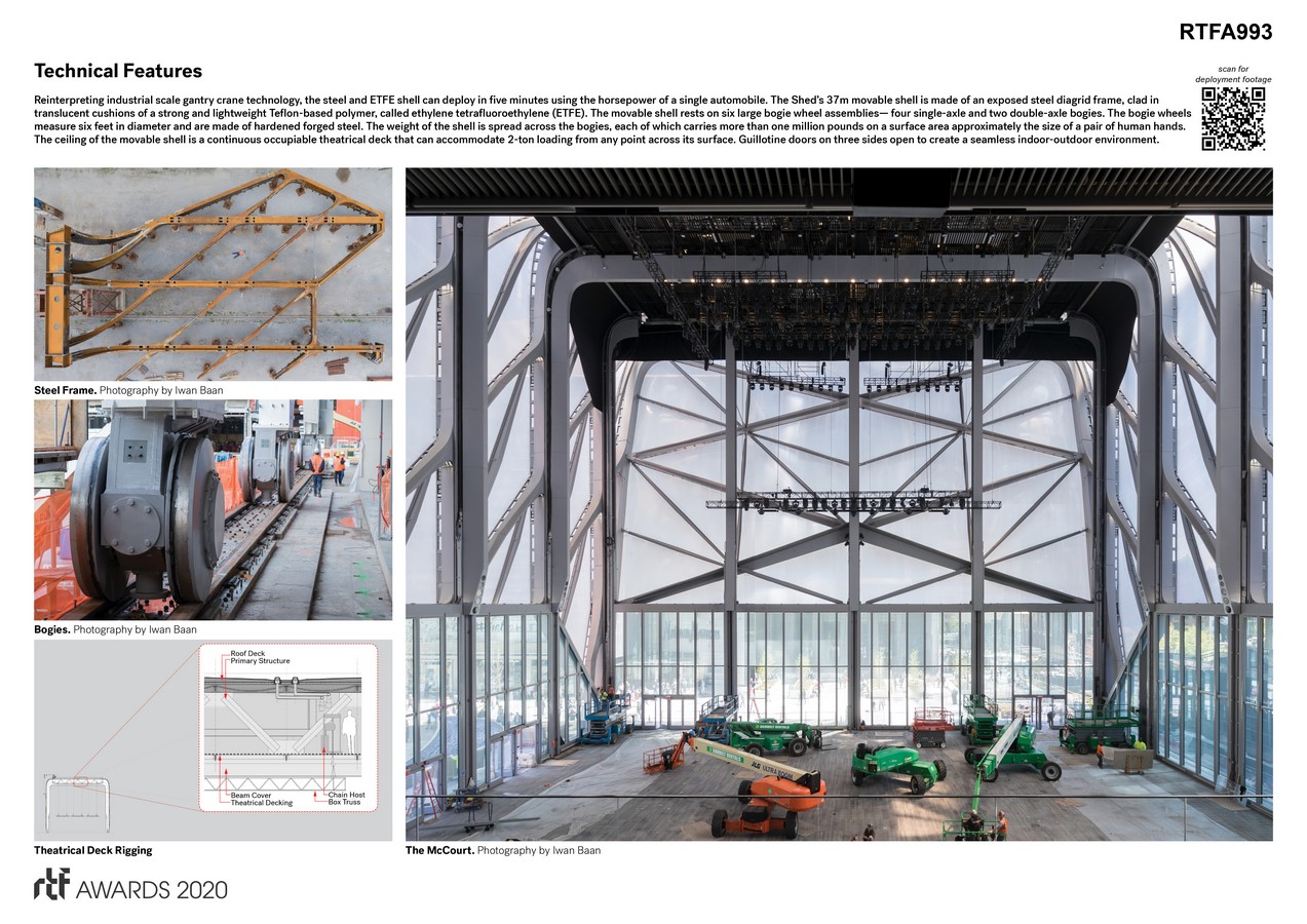 Located on city-owned land where the High Line meets the new Hudson Yards district, The Shed comprises a fixed structure with a stack of column-free galleries encased within a telescoping outer shell that slides onto an adjoining plaza, allowing the building to double its footprint on demand. Reinterpreting industrial-scale gantry crane technology, the steel and ETFE shell can deploy in five minutes using the horsepower of a single automobile.