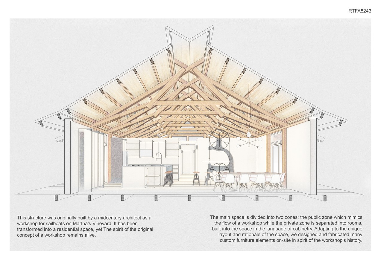The Shop on Martha’s Vineyard was originally designed by Chester Wisniewski, an apprentice to Frank Lloyd Wright, professor at Cooper Union for over two decades, and founder of Davis, Brody and Wisniewski (now Davis, Brody, and Bond) to be used as an active workshop to repair wooden sailboats. In its newest iteration, The Shop has been transformed into a residential space. The spirit of the original concept of a workshop remains alive in The Shop.