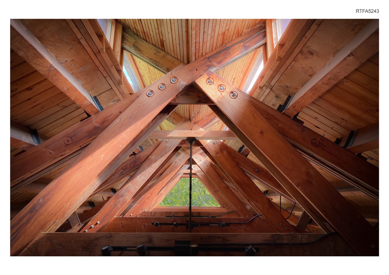 The private zone features wood through different elements and uses, such as expressive grain on the individual ceilings of each room, large slab black walnut barn doors with a natural edge to highlight their natural character, and patterning in the bathrooms and ceilings throughout that express means and methods within construction.