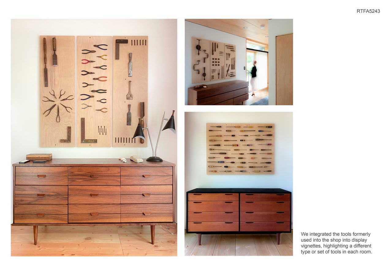 The public zone is designed around the concept that every tool or action in a workshop has its own space. What was once an area for cutting and sanding has transformed to a space for cooking or dinning. The private zone, consisting of bedrooms and bathrooms have pocket doors made out of birch plywood with metal handles that give the feeling as though one is walking into a tool cabinet.